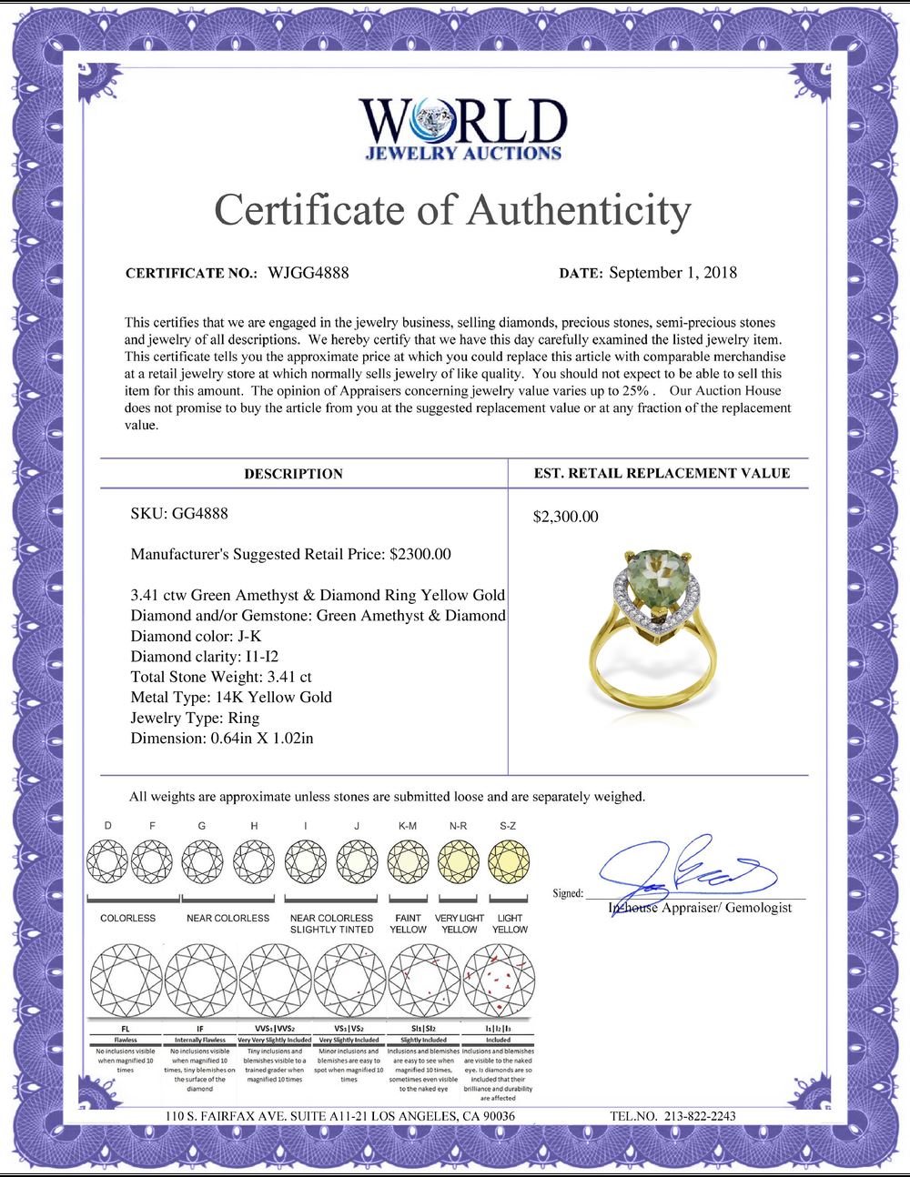 REF-75K4V - SKU: GG4888 ---- Genuine 3.41 ctw Green Amethyst & Diamond Ring 14KT Yellow Gold