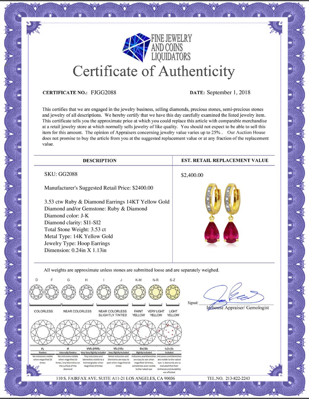 REF-77F2Z ---- SKU:GG-2088 ---- Manufacturer's Suggested Retail Price: $2400.00 ---- Genuine 14K Yellow Gold 3.53 ctw Ruby & Diamond Earrings