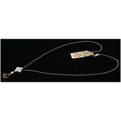Genuine 3.53ctw Citrine Drop Diamond Necklace 14kt **|**|** Mainstone: Citrine ; Total CTW: 3.53 ; Gem QTY: 1 ; Gem CTW: 3.13 ; Dia/CTW: 0.4 ; Diamond Count: 20 ; Diamond Shape: Round ; Grams/Total: 2.95 ; Metal/Purity: 14kt W/G ; MSRP: $1000