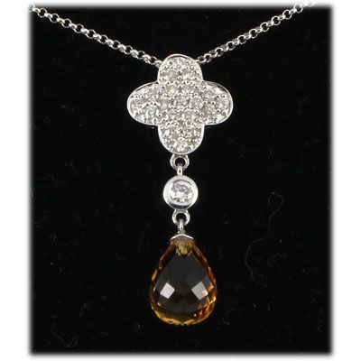 Genuine 3.53ctw Citrine Drop Diamond Necklace 14kt **|**|** Mainstone: Citrine ; Total CTW: 3.53 ; Gem QTY: 1 ; Gem CTW: 3.13 ; Dia/CTW: 0.4 ; Diamond Count: 20 ; Diamond Shape: Round ; Grams/Total: 2.95 ; Metal/Purity: 14kt W/G ; MSRP: $1000