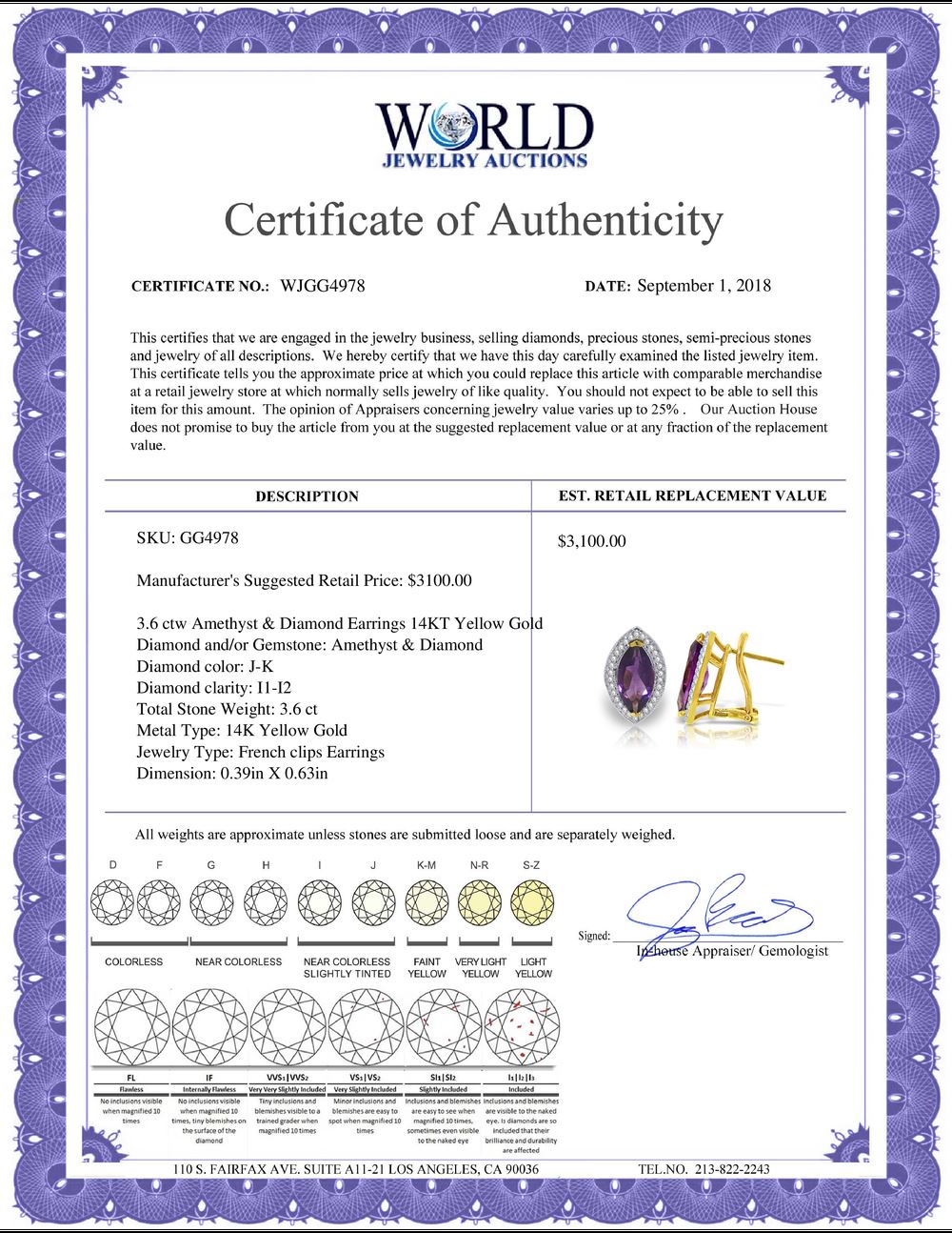 REF-102X2M - SKU: GG4978 ---- Genuine 3.6 ctw Amethyst & Diamond Earrings 14KT Yellow Gold