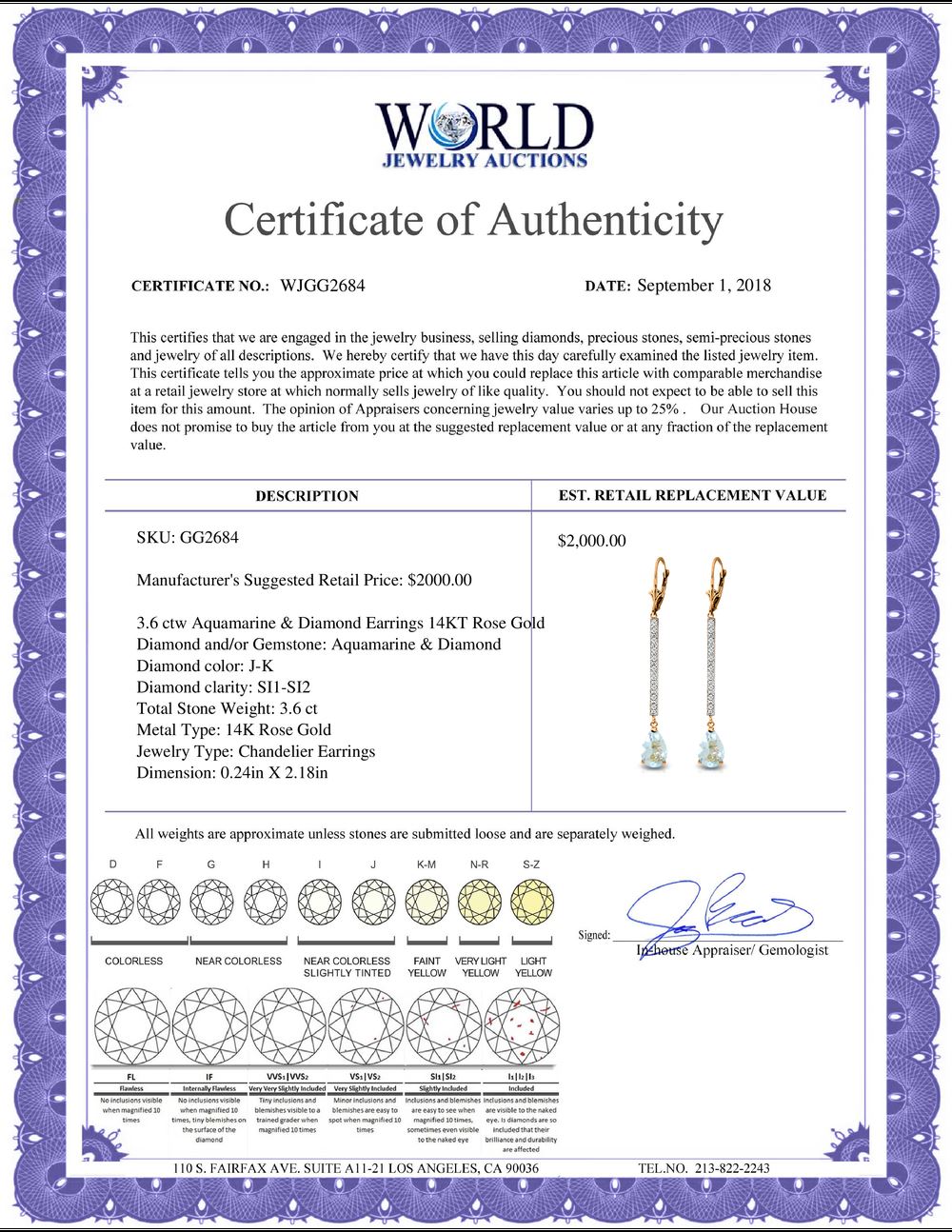 REF-64H6X - SKU: GG2684 ---- Genuine 3.6 ctw Aquamarine & Diamond Earrings 14KT Rose Gold
