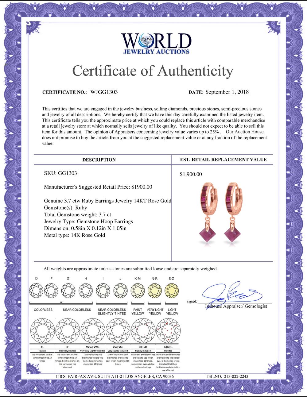 WORLD JEWELRY AUCTION believes to the best of its knowledge that the information presented in any listing has come from reliable sources. Such information is presented solely for the convenience of the Purchaser. WJA makes no warranties of any kind related to the information presented in any listing. WJA further makes no warranties, either express or implied, relating to the value, marketability or condition of the lot described in any listing. Prospective bidders should investigate a lot thoroughly before bidding. By bidding the Bidder acknowledges that Bidder has investigated the lot to his or her satisfaction, or, that Bidder has chosen not to do so, and agrees to accept the lot being bid on with no objections after the sale closes. If you are uncertain please contact us with your questions prior to bidding. If you are still uncertain after we reply, please refrain from bidding. Photos other graphic material contained in any listing of generic or duplicate lots may be stock presentations and not necessarily of the specific lot.