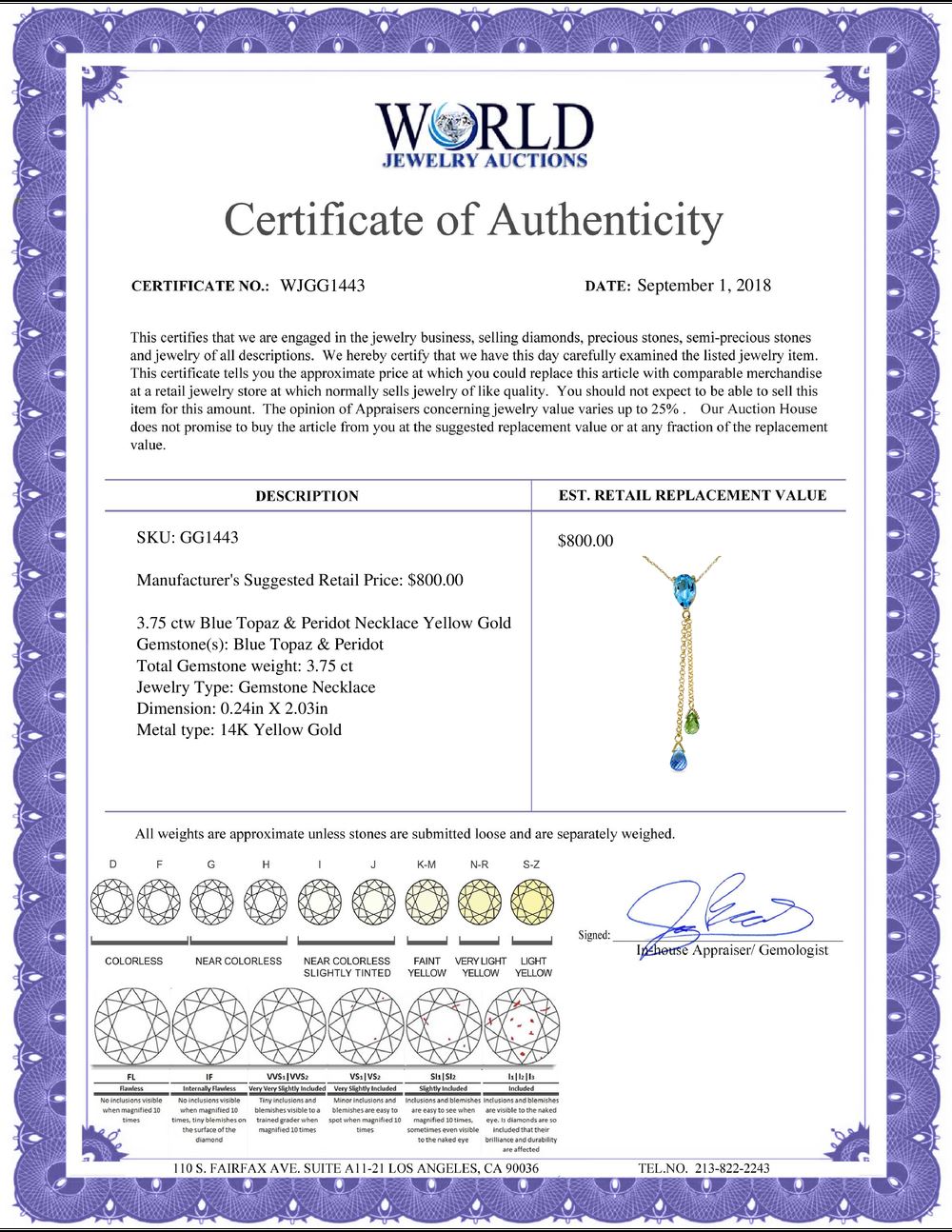 REF-23N5R - SKU: GG1443 ---- Genuine 3.75 ctw Blue Topaz & Peridot Necklace 14KT Yellow Gold