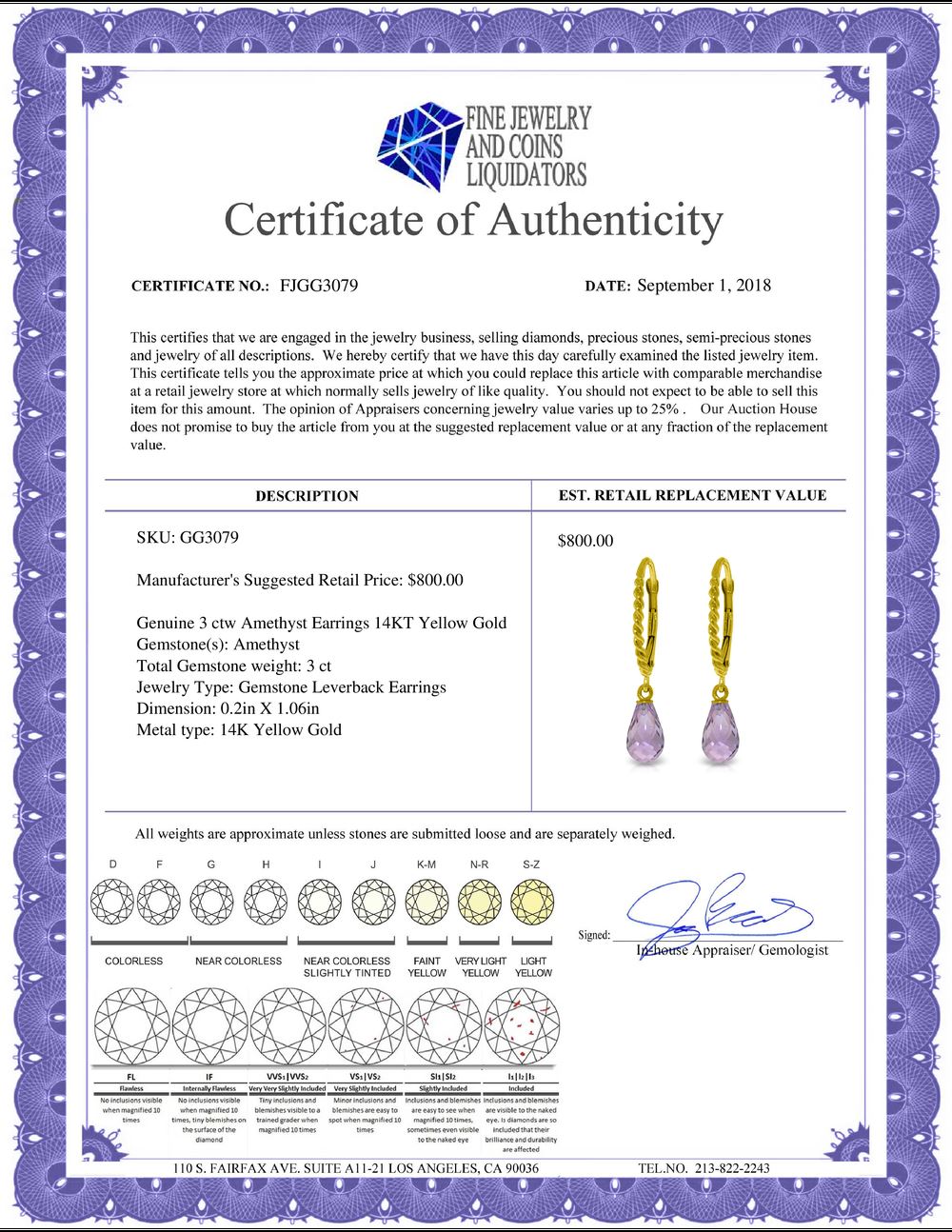 REF-24T3A - SKU: GG3079 ---- Genuine 3 ctw Amethyst Earrings 14KT Yellow Gold