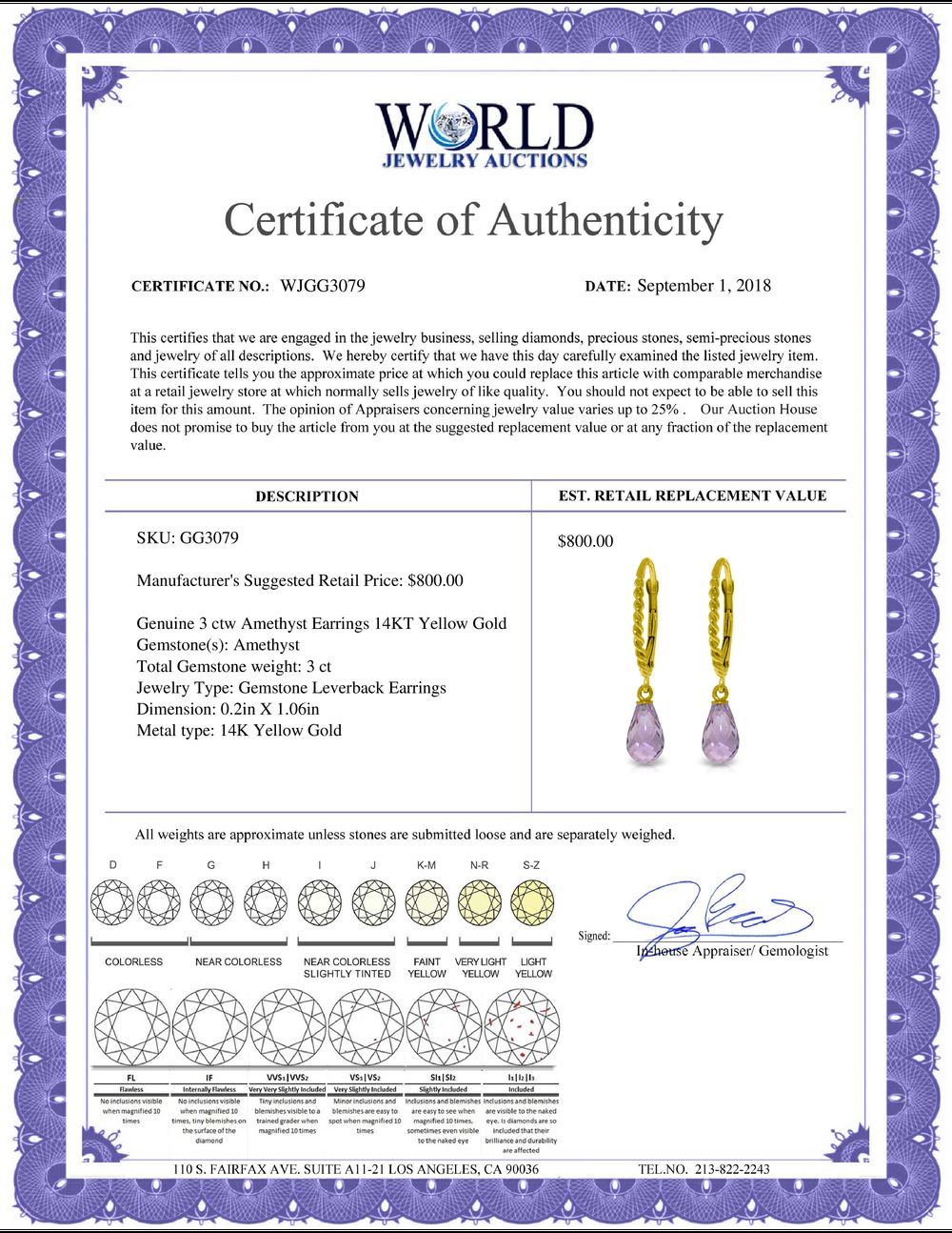 All property is sold “AS IS”, and ALL SALES ARE FINAL. Property is open to thorough public inspection. It is the Bidder’s responsibility to determine condition, age, genuineness, value or any other determinative factor. WJA may attempt to describe the merchandise in advertising and on the Internet but makes no representations. In no event shall WORLD JEWELRY AUCTION be held responsible for having made or implied any warranty of merchantability or fitness for a particular purpose. Bidder shall be the sole judge of value.