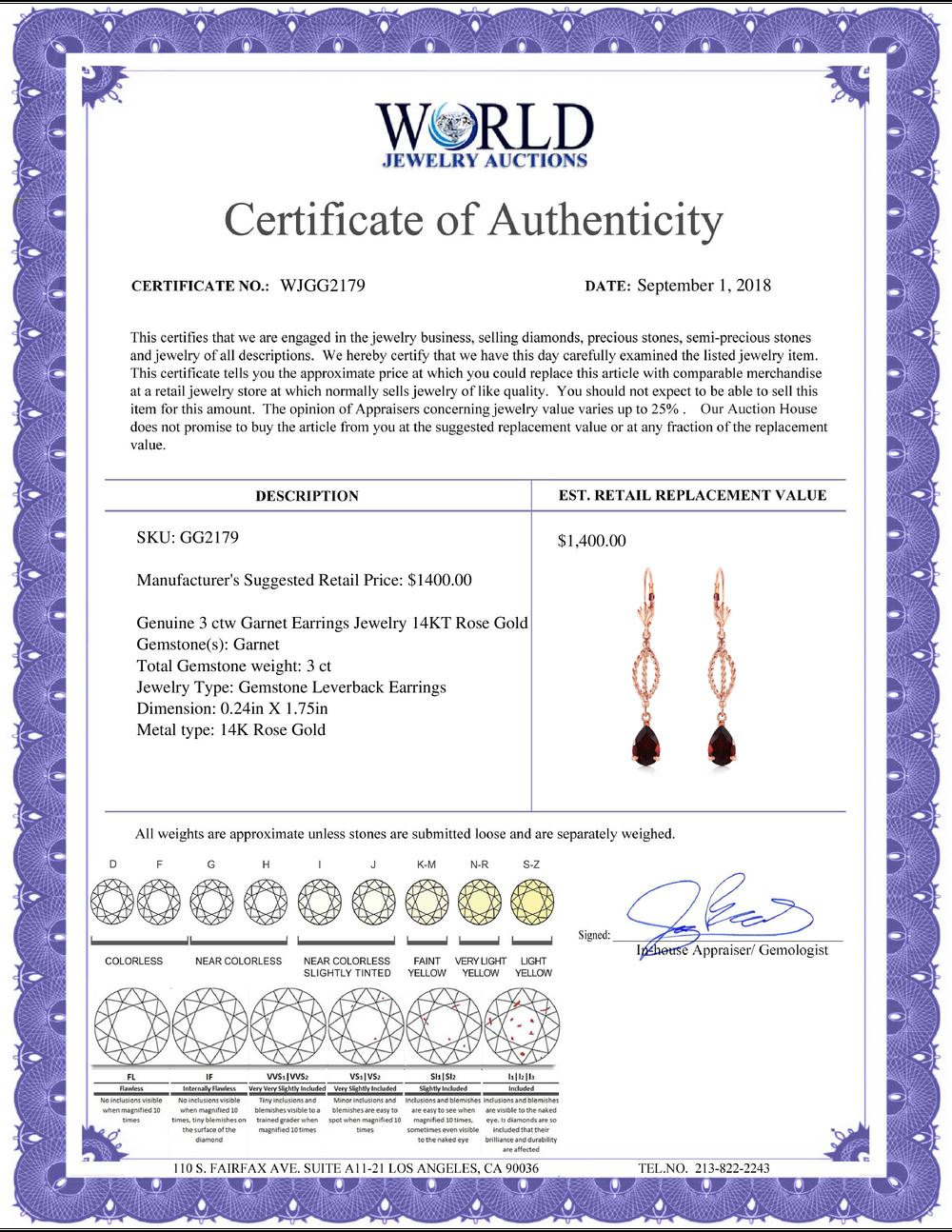 All property is sold “AS IS”, and ALL SALES ARE FINAL. Property is open to thorough public inspection. It is the Bidder’s responsibility to determine condition, age, genuineness, value or any other determinative factor. WJA may attempt to describe the merchandise in advertising and on the Internet but makes no representations. In no event shall WORLD JEWELRY AUCTION be held responsible for having made or implied any warranty of merchantability or fitness for a particular purpose. Bidder shall be the sole judge of value.