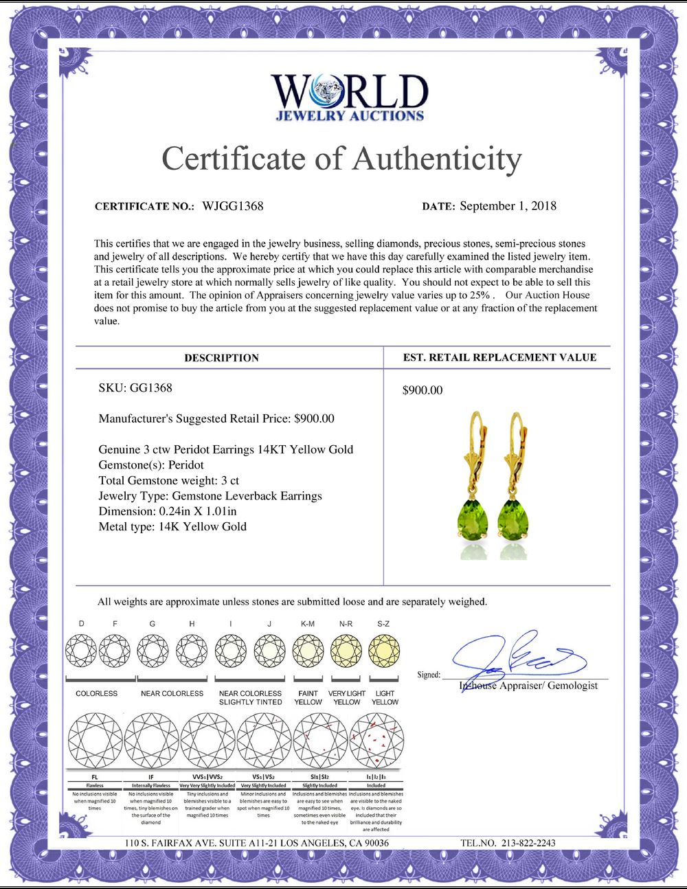 Genuine 14K Yellow Gold 3 ctw Peridot Earrings