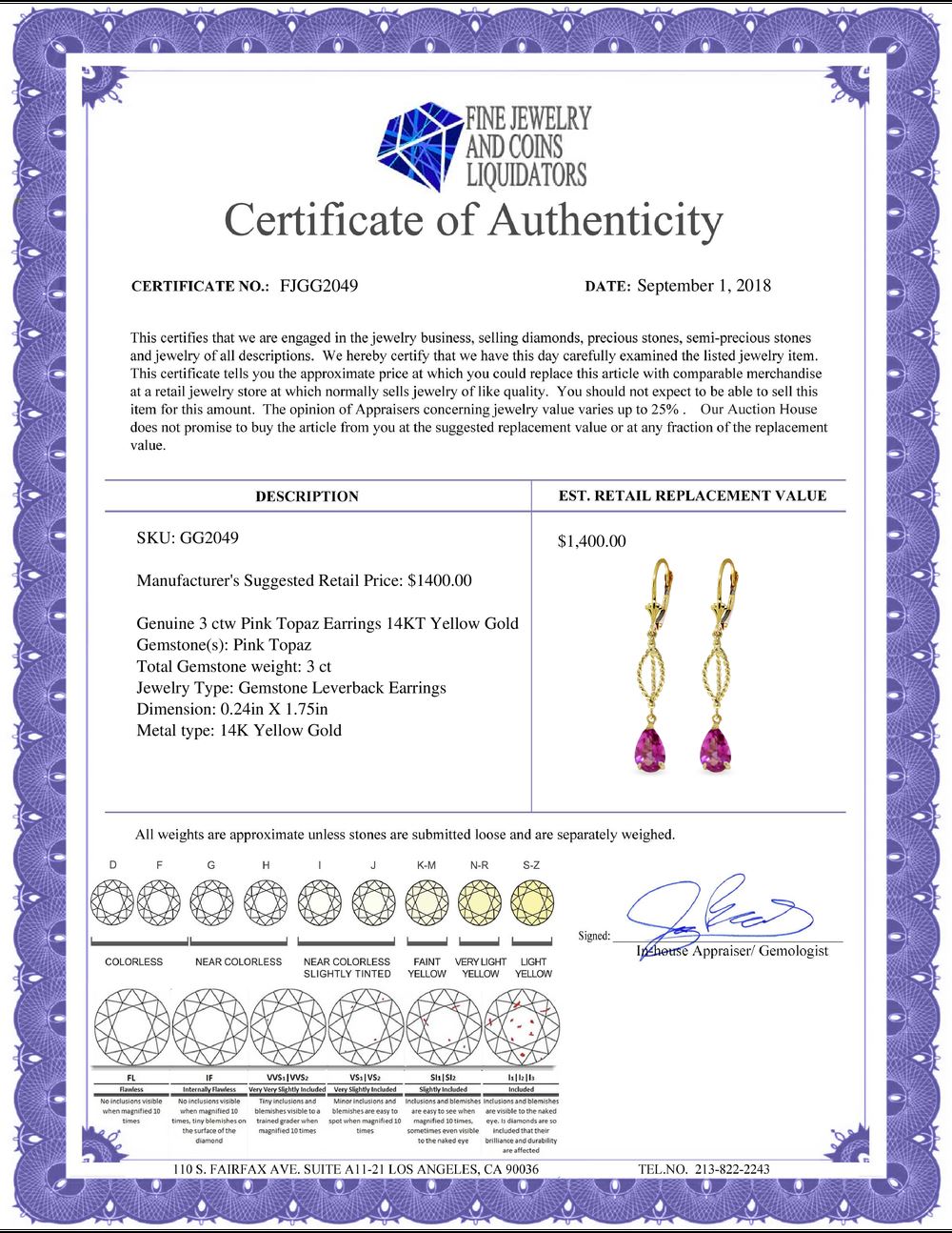 REF-46R2P - SKU: GG2049 ---- Genuine 3 ctw Pink Topaz Earrings 14KT Yellow Gold