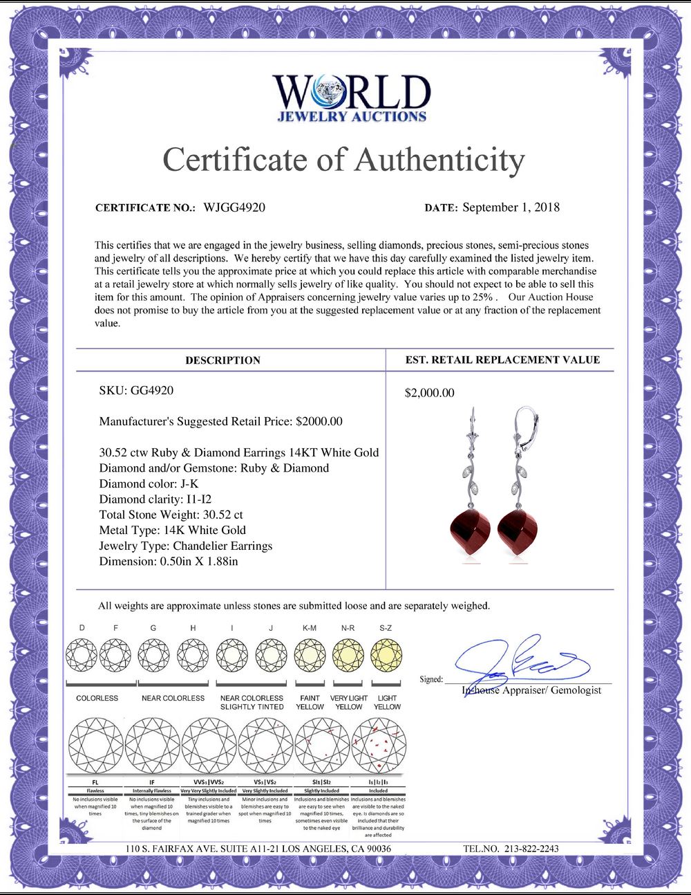All property is sold “AS IS”, and ALL SALES ARE FINAL. Property is open to thorough public inspection. It is the Bidder’s responsibility to determine condition, age, genuineness, value or any other determinative factor. WJA may attempt to describe the merchandise in advertising and on the Internet but makes no representations. In no event shall WORLD JEWELRY AUCTION be held responsible for having made or implied any warranty of merchantability or fitness for a particular purpose. Bidder shall be the sole judge of value.