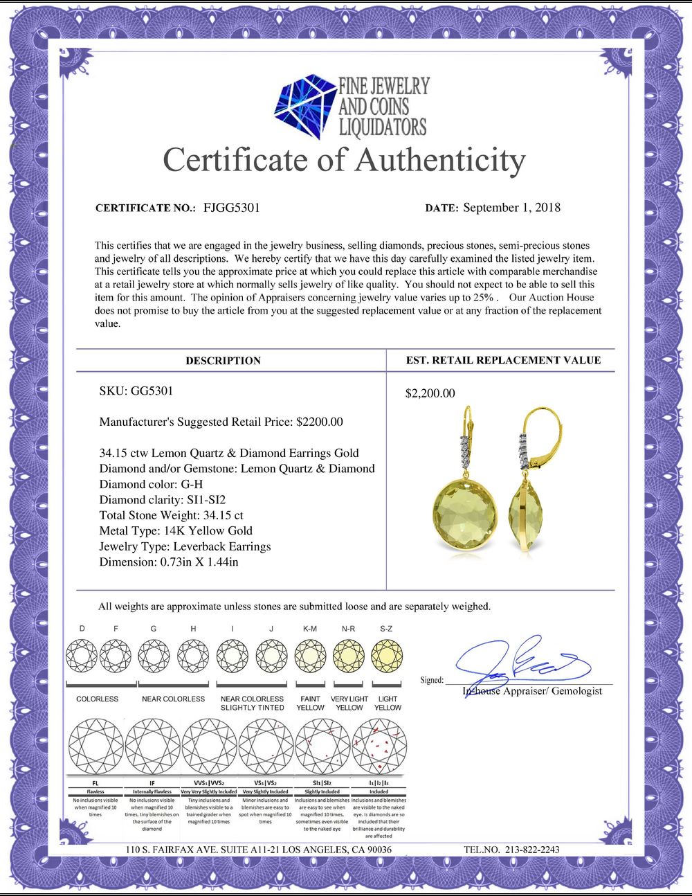 REF-73W3Y - SKU: GG5301 ---- Genuine 34.15 ctw Lemon Quartz & Diamond Earrings 14KT Yellow Gold