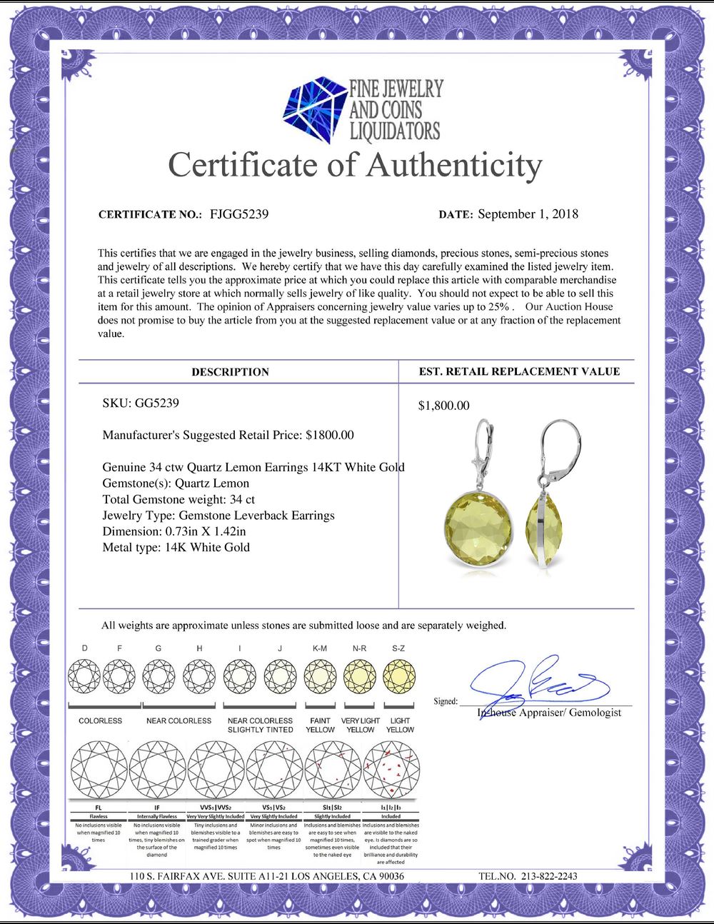 REF-58X2M - SKU: GG5239 ---- Genuine 34 ctw Quartz Lemon Earrings 14KT White Gold