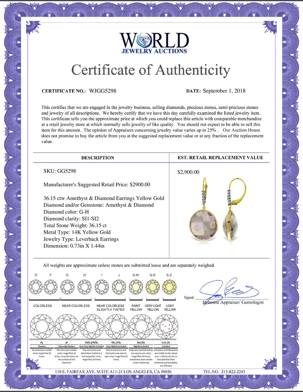 WORLD JEWELRY AUCTION believes to the best of its knowledge that the information presented in any listing has come from reliable sources. Such information is presented solely for the convenience of the Purchaser. WJA makes no warranties of any kind related to the information presented in any listing. WJA further makes no warranties, either express or implied, relating to the value, marketability or condition of the lot described in any listing. Prospective bidders should investigate a lot thoroughly before bidding. By bidding the Bidder acknowledges that Bidder has investigated the lot to his or her satisfaction, or, that Bidder has chosen not to do so, and agrees to accept the lot being bid on with no objections after the sale closes. If you are uncertain please contact us with your questions prior to bidding. If you are still uncertain after we reply, please refrain from bidding. Photos other graphic material contained in any listing of generic or duplicate lots may be stock presentations and not necessarily of the specific lot.