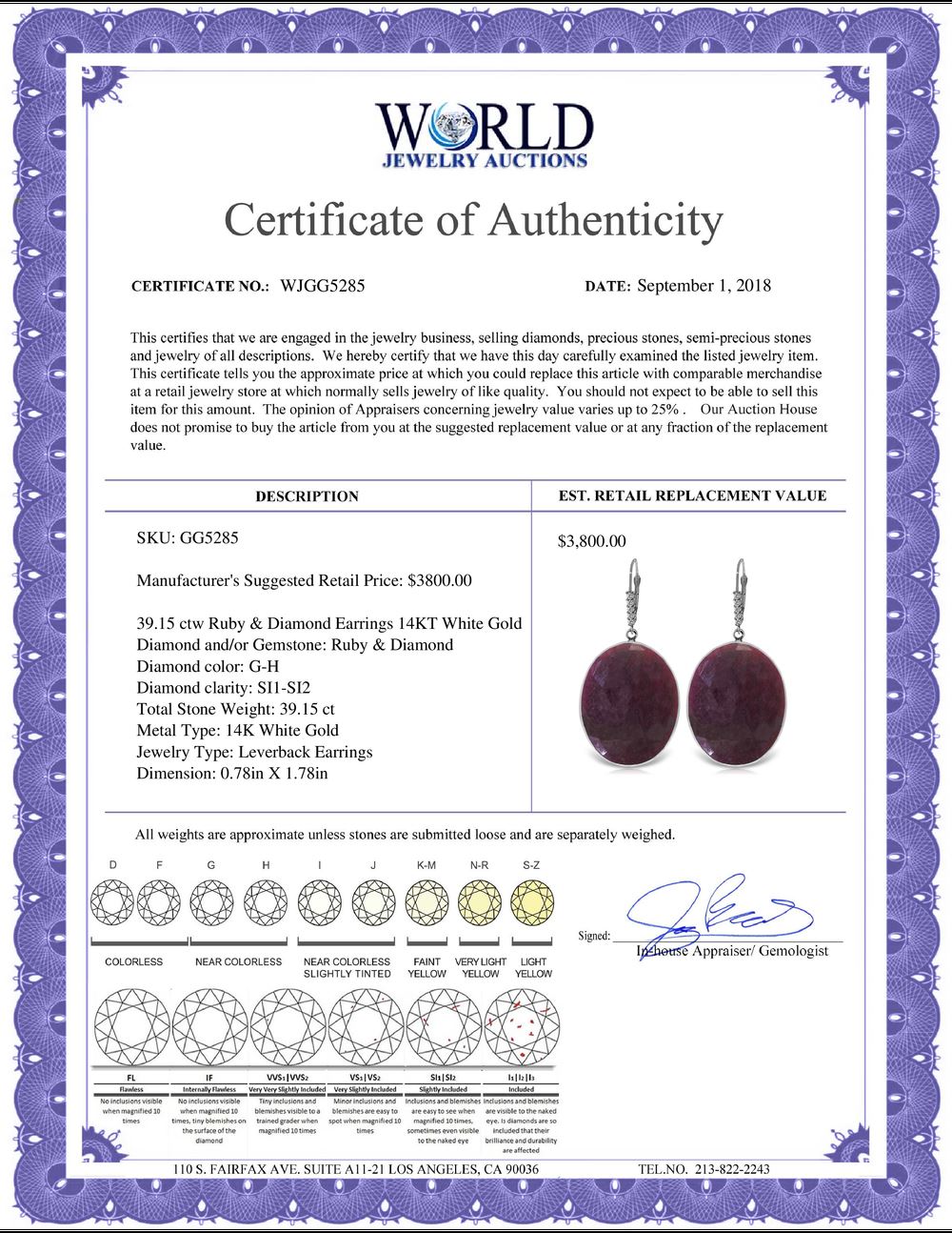 All property is sold “AS IS”, and ALL SALES ARE FINAL. Property is open to thorough public inspection. It is the Bidder’s responsibility to determine condition, age, genuineness, value or any other determinative factor. WJA may attempt to describe the merchandise in advertising and on the Internet but makes no representations. In no event shall WORLD JEWELRY AUCTION be held responsible for having made or implied any warranty of merchantability or fitness for a particular purpose. Bidder shall be the sole judge of value.