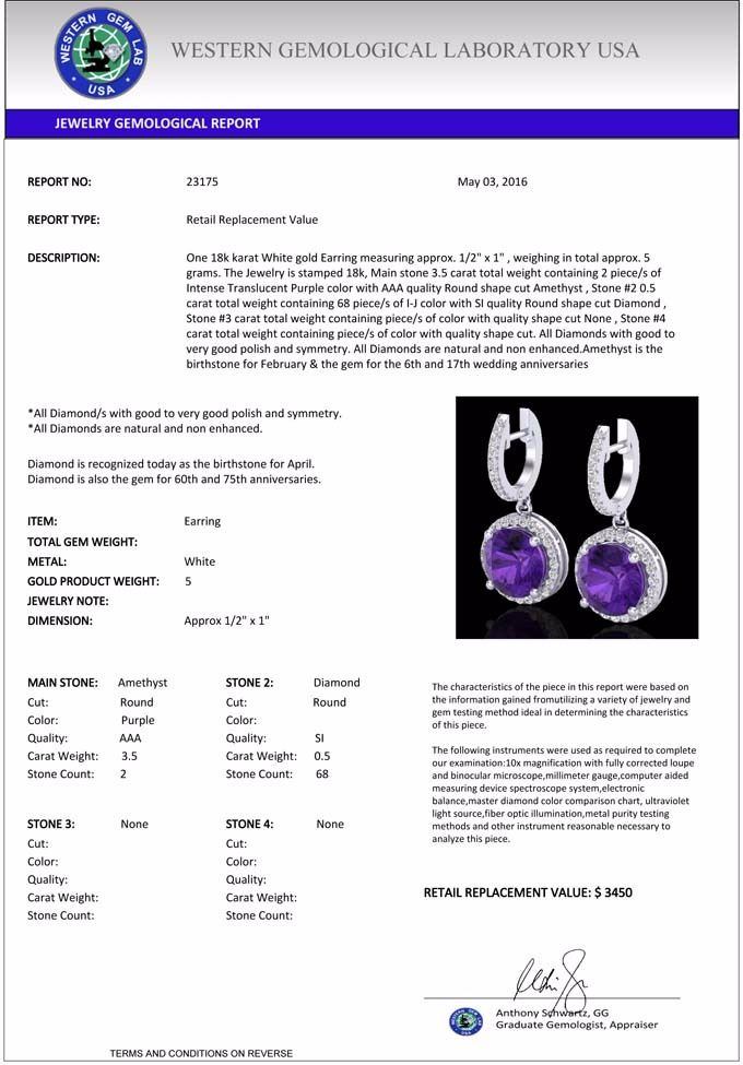 total approx. 5 grams. The Jewelry is stamped 18k, Main stone 3.5 carat total weight containing 2 piece/s of Intense Translucent Purple color with