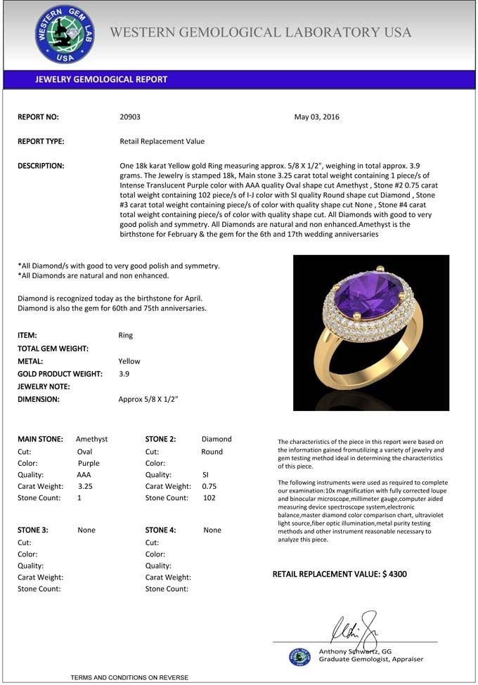 total approx. 3.9 grams. The Jewelry is stamped 18k, Main stone 3.25 carat total weight containing 1 piece/s of Intense Translucent Purple color with