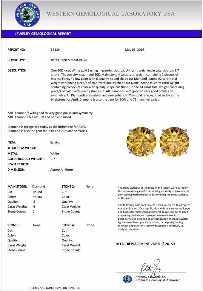 total approx. 2.7 grams. The Jewelry is stamped 10K, Main stone 4 carat total weight containing 2 piece/s of Intense Fancy Yellow color with