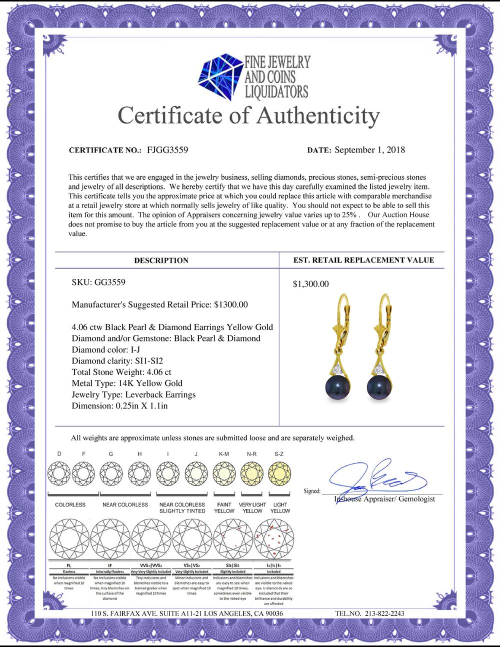 Genuine 14K Yellow Gold 4.06 ctw Black Pearl & Diamond Earrings