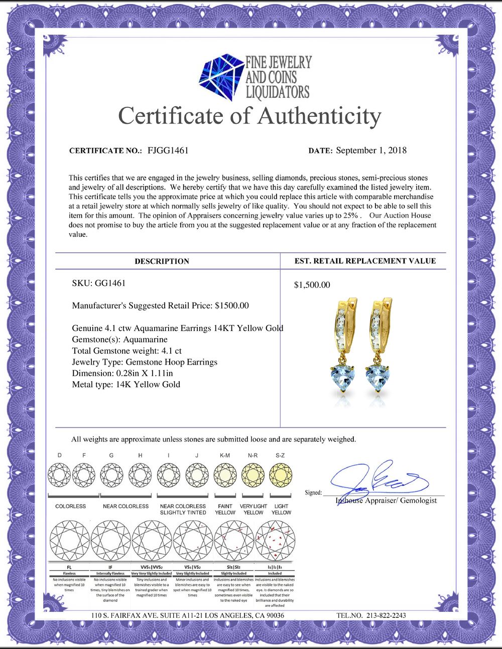 REF-49K2V - SKU: GG1461 ---- Genuine 4.1 ctw Aquamarine Earrings 14KT Yellow Gold