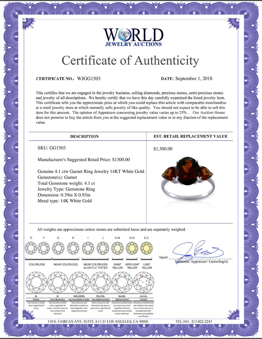 WORLD JEWELRY AUCTION believes to the best of its knowledge that the information presented in any listing has come from reliable sources. Such information is presented solely for the convenience of the Purchaser. WJA makes no warranties of any kind related to the information presented in any listing. WJA further makes no warranties, either express or implied, relating to the value, marketability or condition of the lot described in any listing. Prospective bidders should investigate a lot thoroughly before bidding. By bidding the Bidder acknowledges that Bidder has investigated the lot to his or her satisfaction, or, that Bidder has chosen not to do so, and agrees to accept the lot being bid on with no objections after the sale closes. If you are uncertain please contact us with your questions prior to bidding. If you are still uncertain after we reply, please refrain from bidding. Photos other graphic material contained in any listing of generic or duplicate lots may be stock presentations and not necessarily of the specific lot.