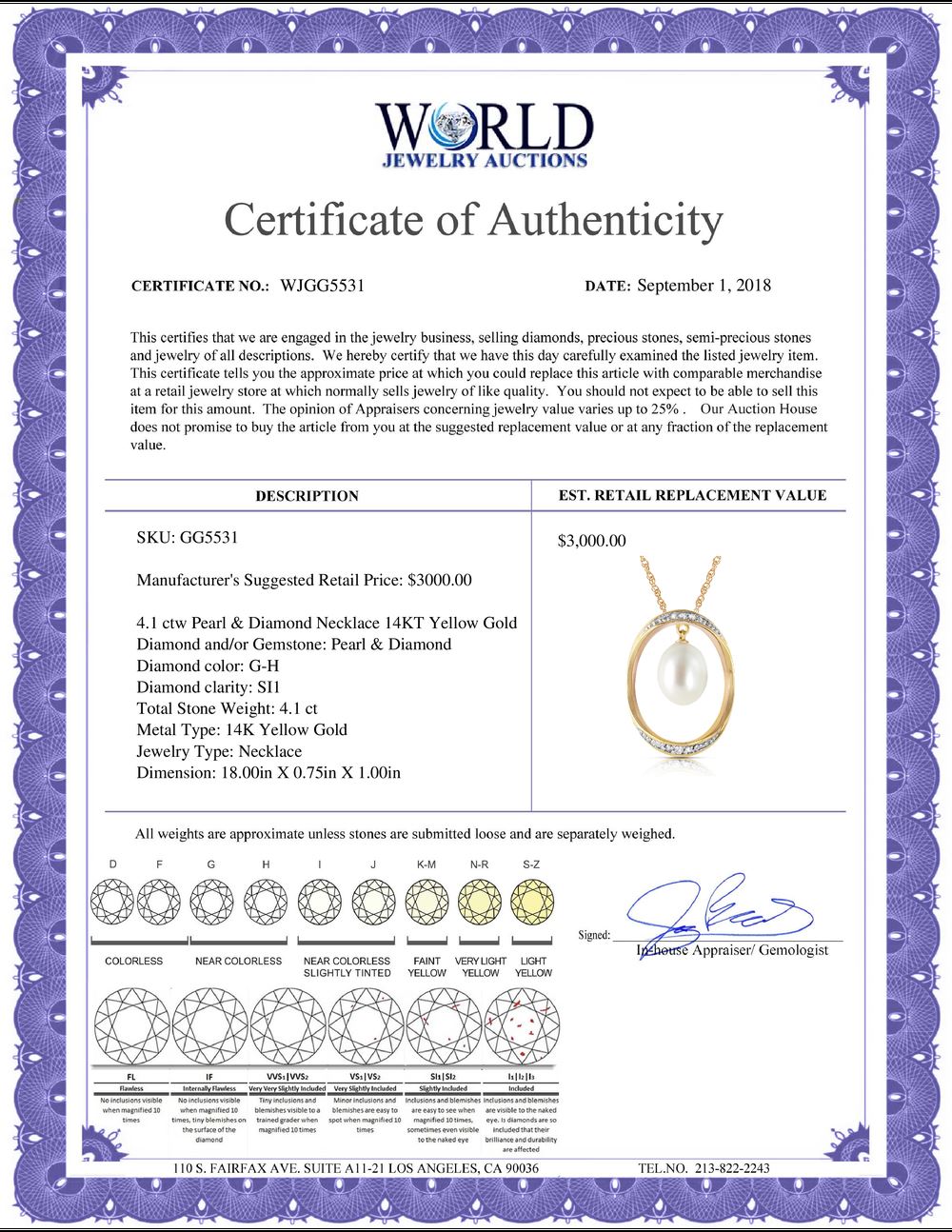 All property is sold “AS IS”, and ALL SALES ARE FINAL. Property is open to thorough public inspection. It is the Bidder’s responsibility to determine condition, age, genuineness, value or any other determinative factor. WJA may attempt to describe the merchandise in advertising and on the Internet but makes no representations. In no event shall WORLD JEWELRY AUCTION be held responsible for having made or implied any warranty of merchantability or fitness for a particular purpose. Bidder shall be the sole judge of value.