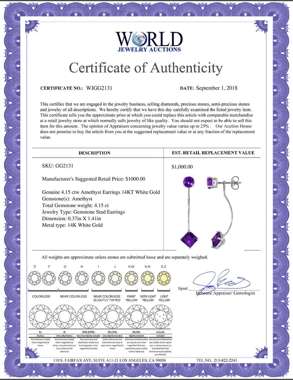REF-32H2X - SKU: GG2131 ---- Genuine 4.15 ctw Amethyst Earrings 14KT White Gold