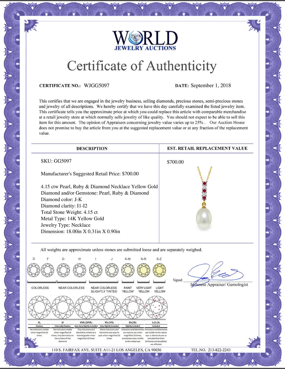 All property is sold “AS IS”, and ALL SALES ARE FINAL. Property is open to thorough public inspection. It is the Bidder’s responsibility to determine condition, age, genuineness, value or any other determinative factor. WJA may attempt to describe the merchandise in advertising and on the Internet but makes no representations. In no event shall WORLD JEWELRY AUCTION be held responsible for having made or implied any warranty of merchantability or fitness for a particular purpose. Bidder shall be the sole judge of value.