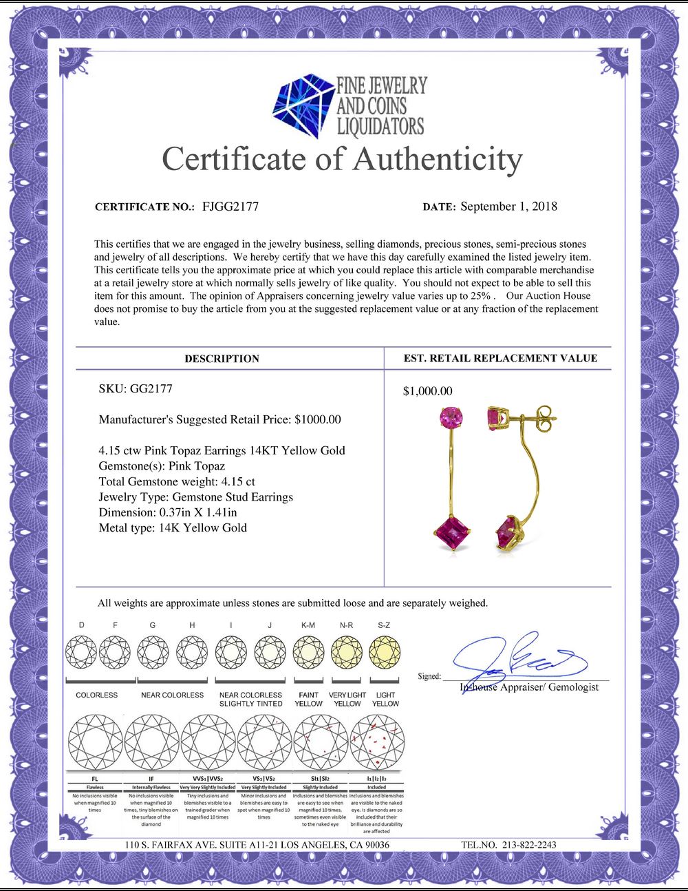 REF-32N8R - SKU: GG2177 ---- Genuine 4.15 ctw Pink Topaz Earrings 14KT Yellow Gold