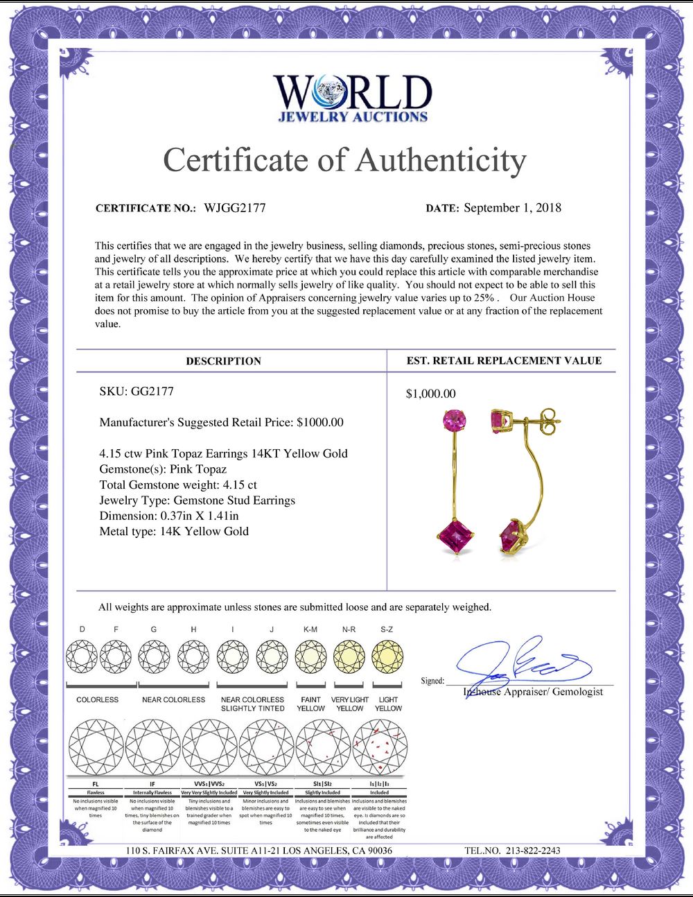 REF-32N8R - SKU: GG2177 ---- Genuine 4.15 ctw Pink Topaz Earrings 14KT Yellow Gold
