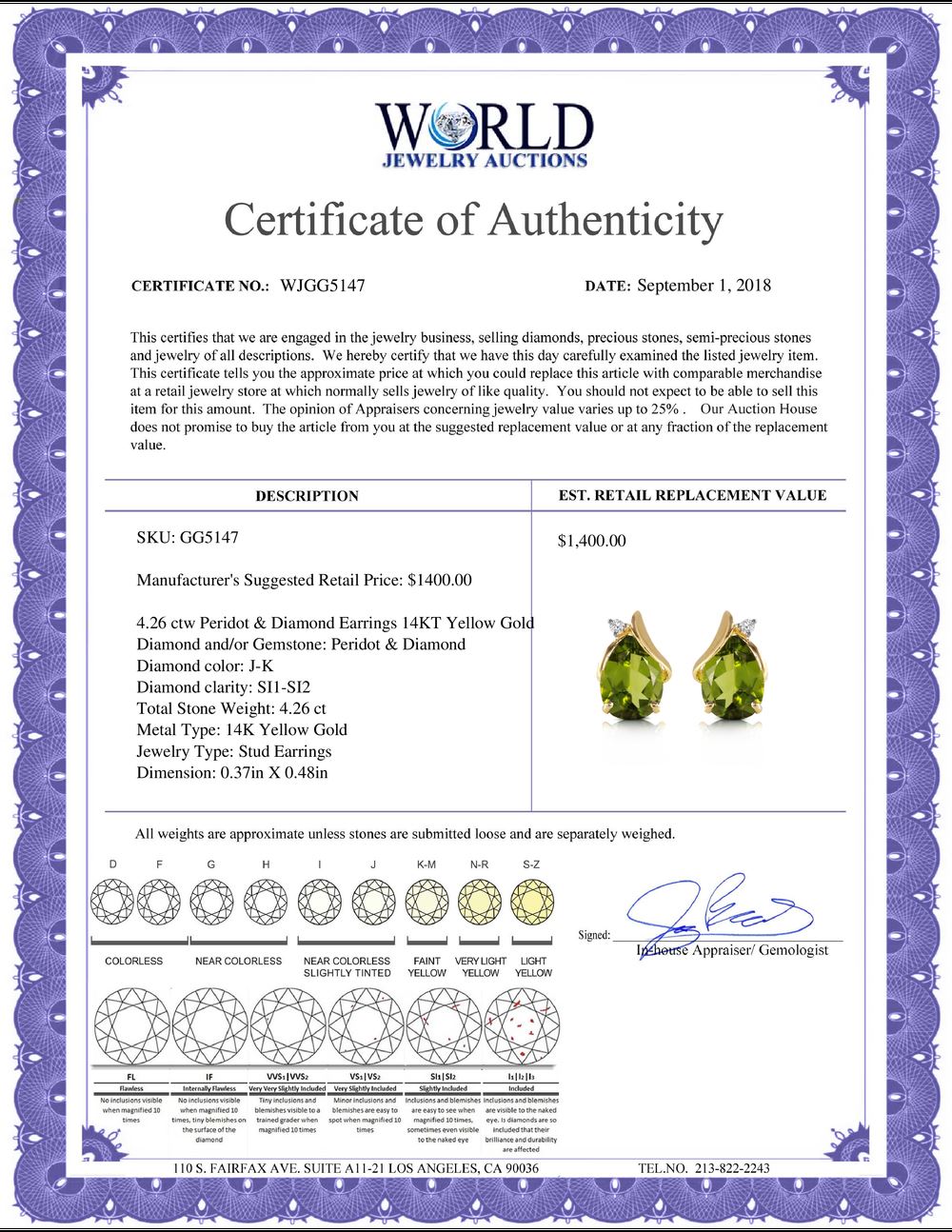 All property is sold “AS IS”, and ALL SALES ARE FINAL. Property is open to thorough public inspection. It is the Bidder’s responsibility to determine condition, age, genuineness, value or any other determinative factor. WJA may attempt to describe the merchandise in advertising and on the Internet but makes no representations. In no event shall WORLD JEWELRY AUCTION be held responsible for having made or implied any warranty of merchantability or fitness for a particular purpose. Bidder shall be the sole judge of value.