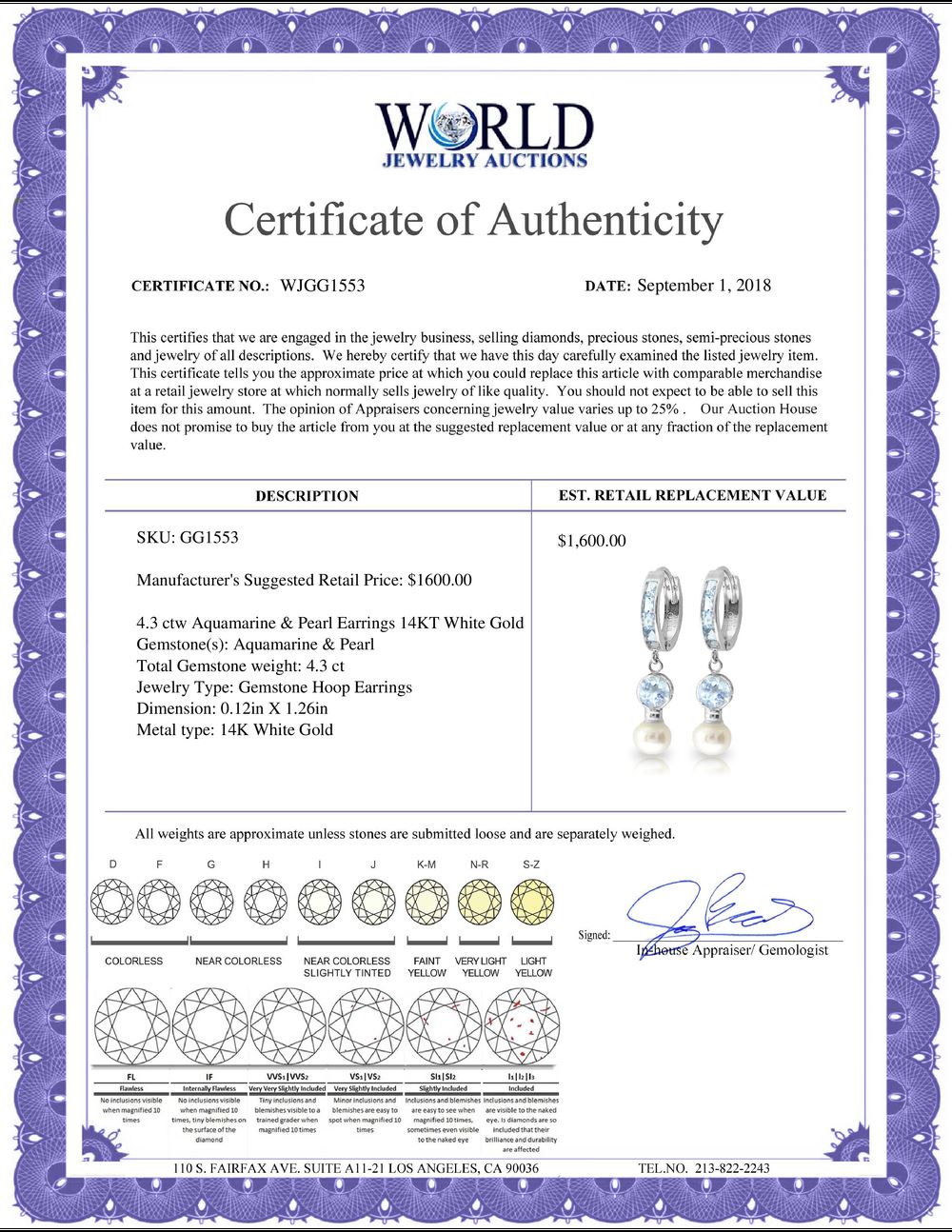 REF-52X9M - SKU: GG1553 ---- Genuine 4.3 ctw Aquamarine & Pearl Earrings 14KT White Gold