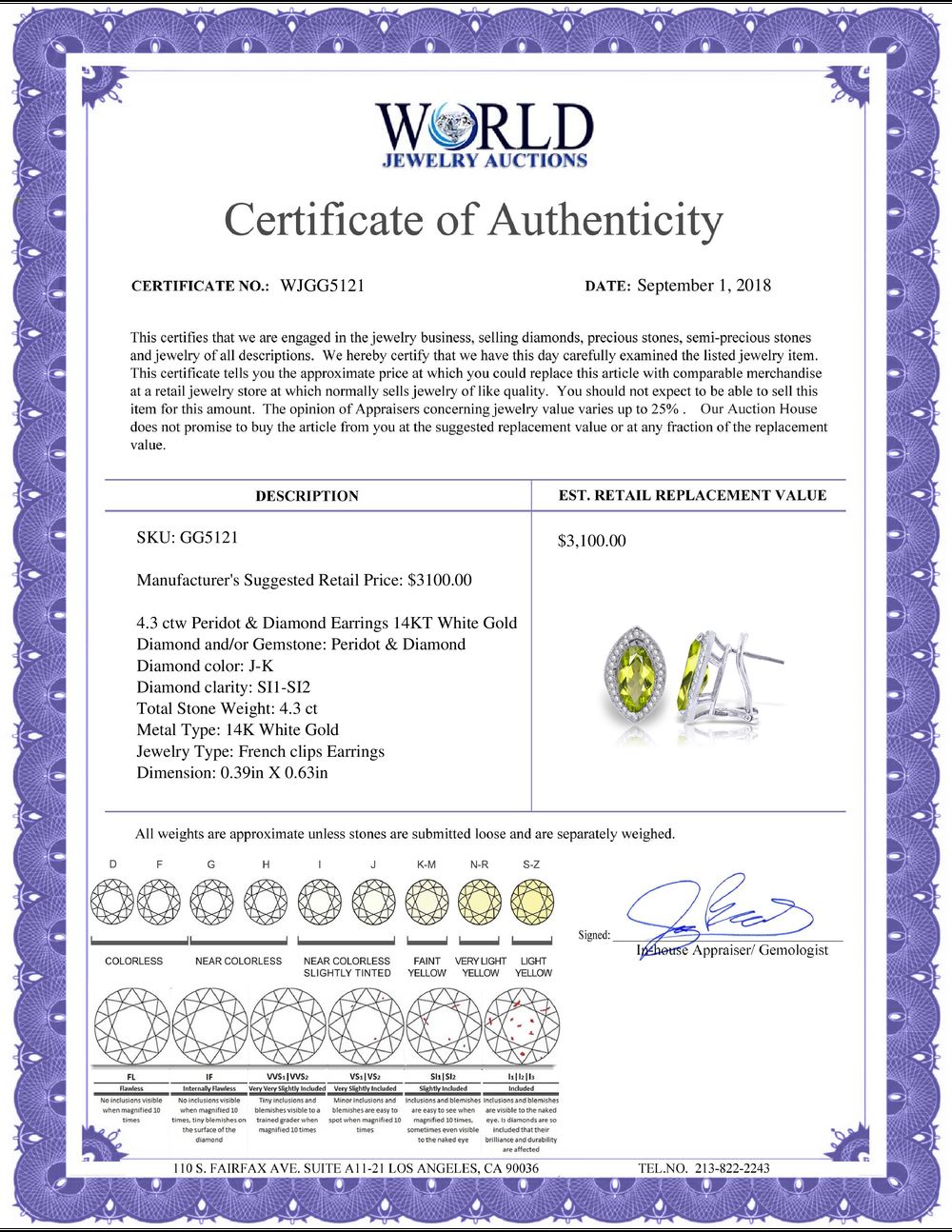 REF-102P8H - SKU: GG5121 ---- Genuine 4.3 ctw Peridot & Diamond Earrings 14KT White Gold