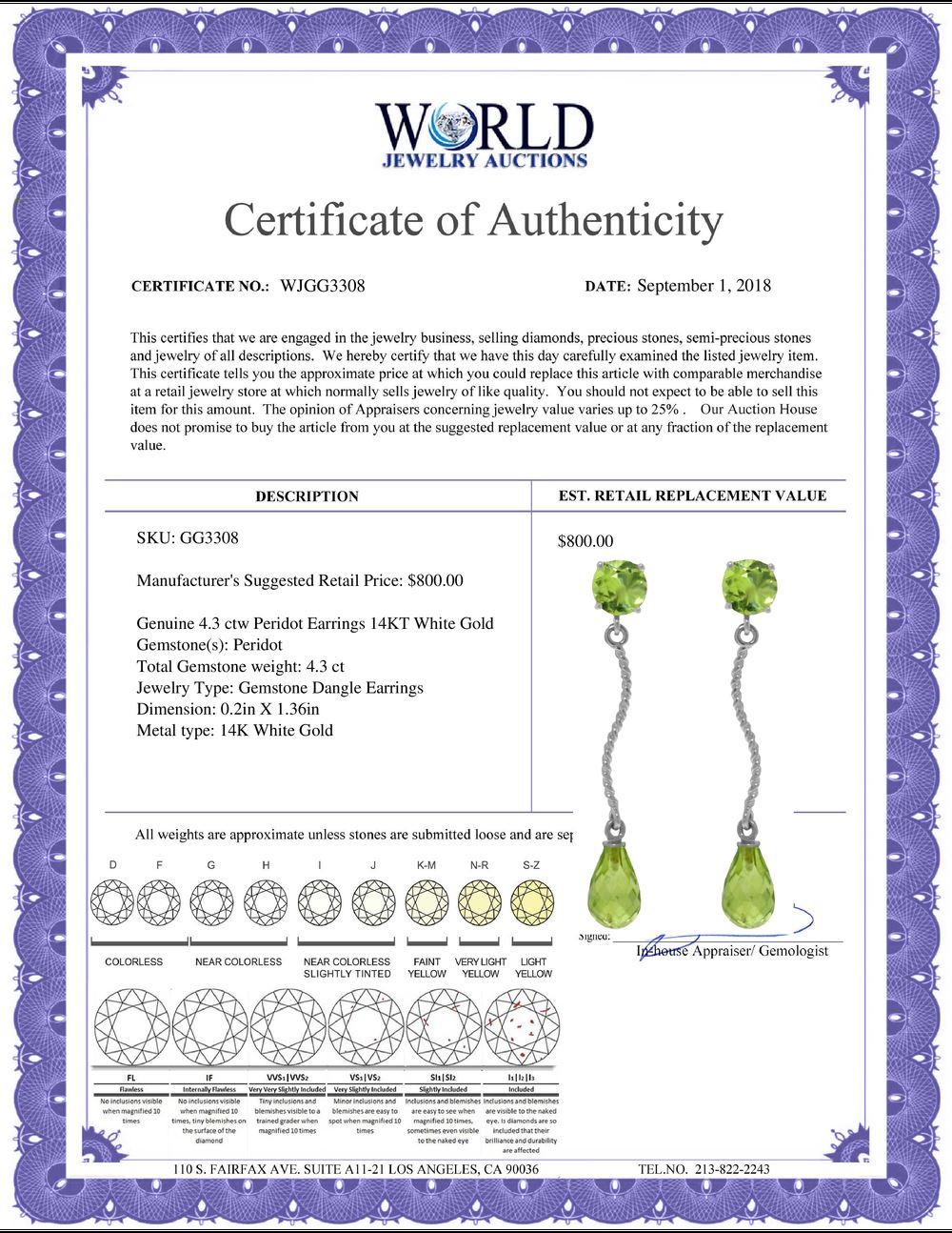 REF-23Y5F - SKU: GG3308 ---- Genuine 4.3 ctw Peridot Earrings 14KT White Gold