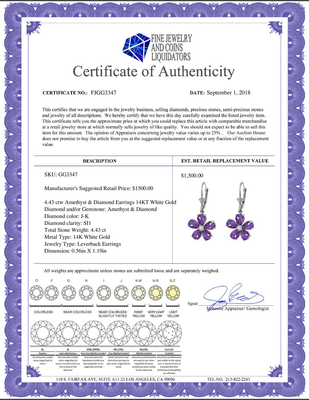 REF-49Y8F - SKU: GG3347 ---- Genuine 4.43 ctw Amethyst & Diamond Earrings 14KT White Gold