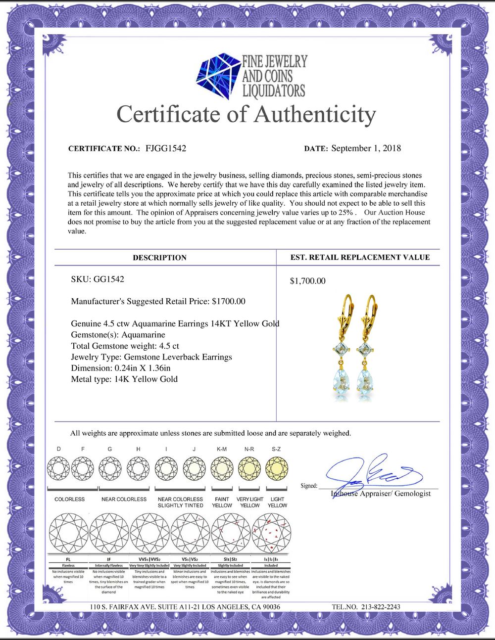 REF-54M5T - SKU: GG1542 ---- Genuine 4.5 ctw Aquamarine Earrings 14KT Yellow Gold