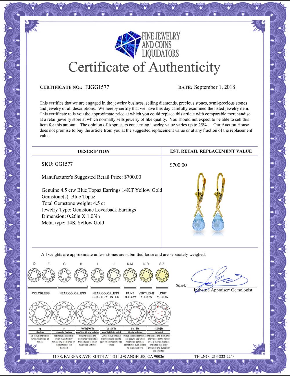 REF-22M7T - SKU: GG1577 ---- Genuine 4.5 ctw Blue Topaz Earrings 14KT Yellow Gold