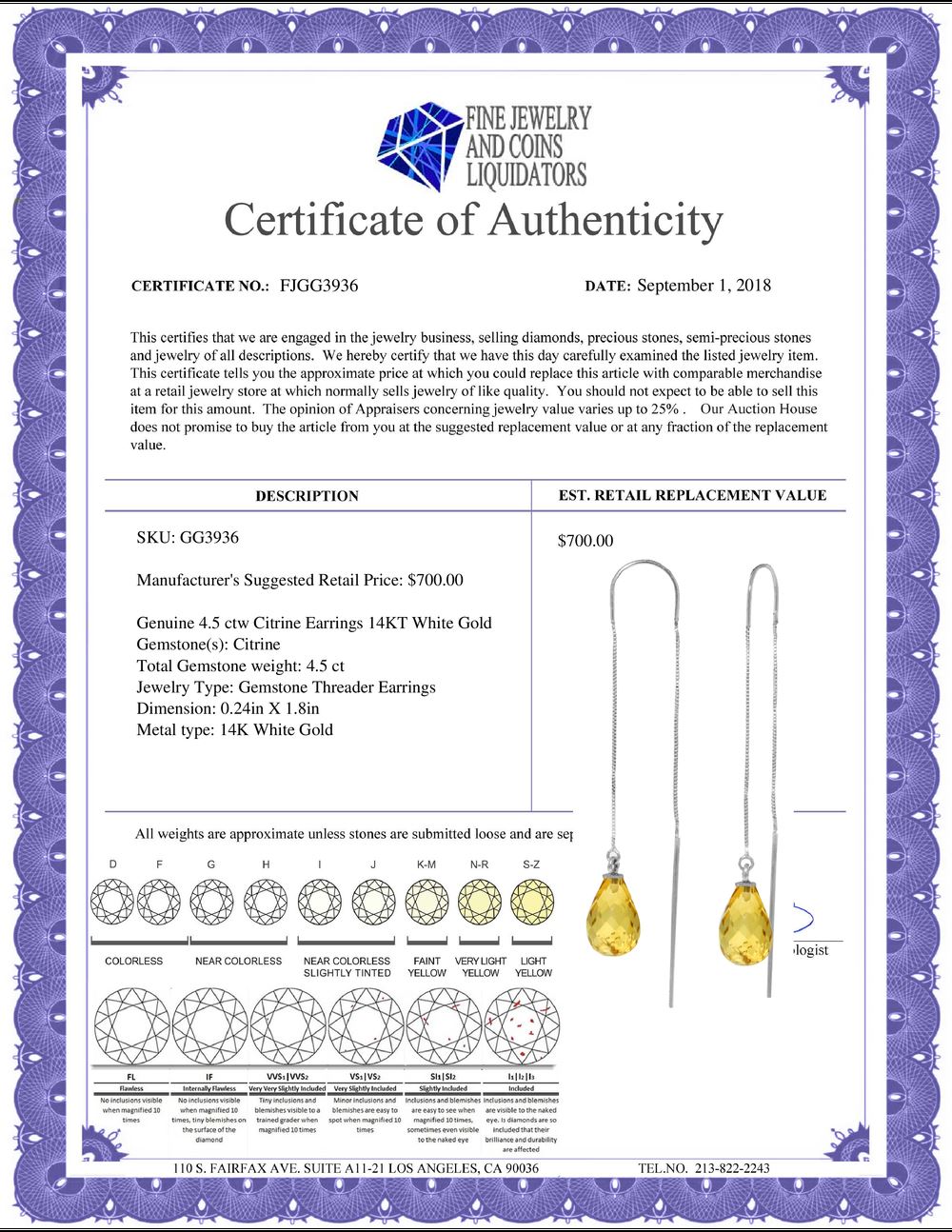 REF-20H4X - SKU: GG3936 ---- Genuine 4.5 ctw Citrine Earrings 14KT White Gold