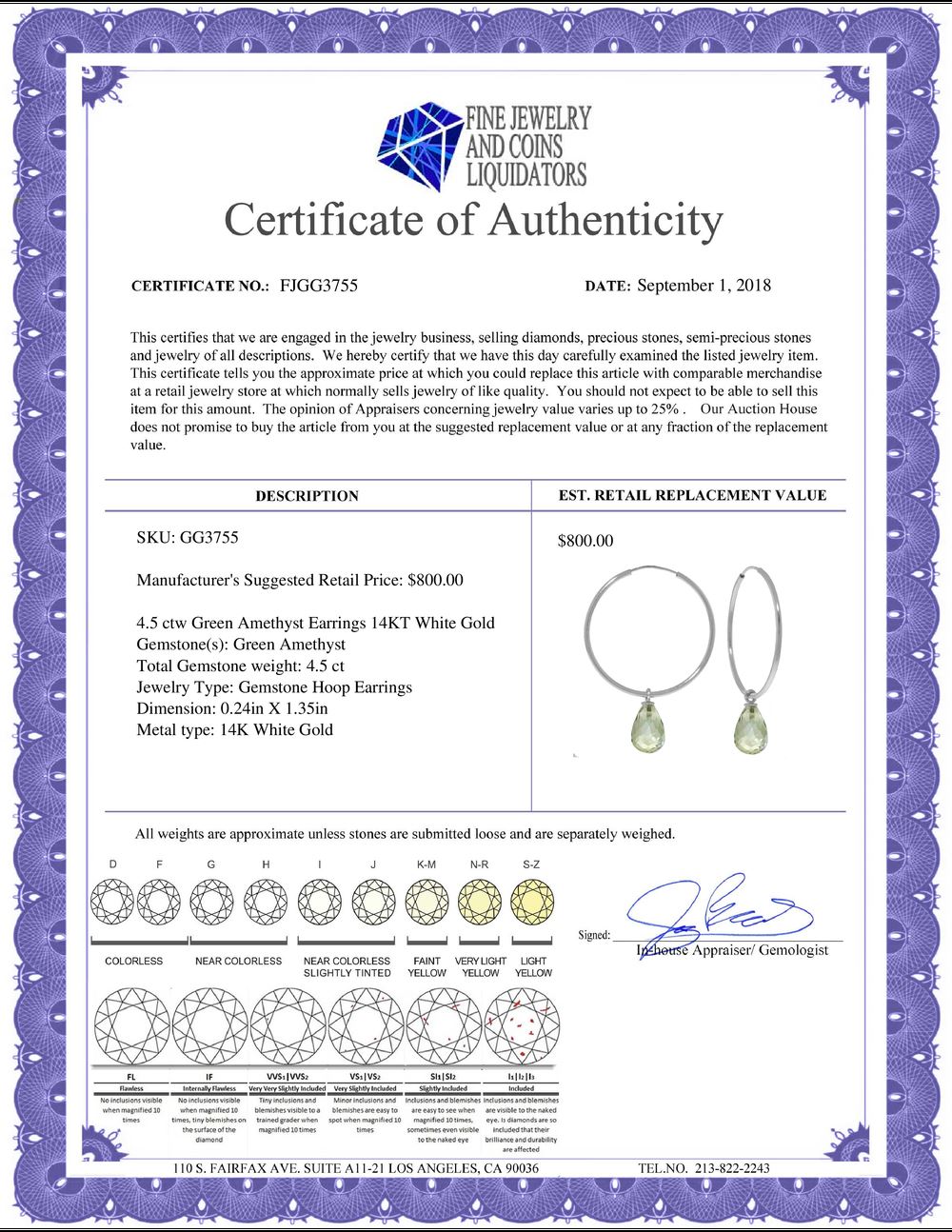 REF-26R2P - SKU: GG3755 ---- Genuine 4.5 ctw Green Amethyst Earrings 14KT White Gold