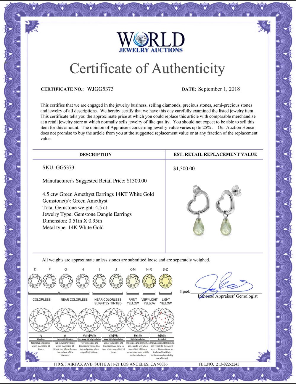 WORLD JEWELRY AUCTION believes to the best of its knowledge that the information presented in any listing has come from reliable sources. Such information is presented solely for the convenience of the Purchaser. WJA makes no warranties of any kind related to the information presented in any listing. WJA further makes no warranties, either express or implied, relating to the value, marketability or condition of the lot described in any listing. Prospective bidders should investigate a lot thoroughly before bidding. By bidding the Bidder acknowledges that Bidder has investigated the lot to his or her satisfaction, or, that Bidder has chosen not to do so, and agrees to accept the lot being bid on with no objections after the sale closes. If you are uncertain please contact us with your questions prior to bidding. If you are still uncertain after we reply, please refrain from bidding. Photos other graphic material contained in any listing of generic or duplicate lots may be stock presentations and not necessarily of the specific lot.