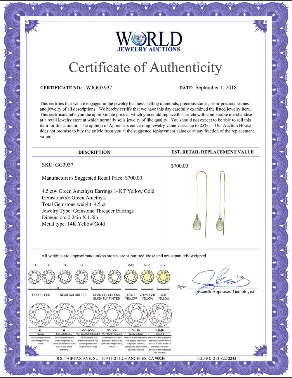 REF-20Y4F - SKU: GG3937 ---- Genuine 4.5 ctw Green Amethyst Earrings 14KT Yellow Gold