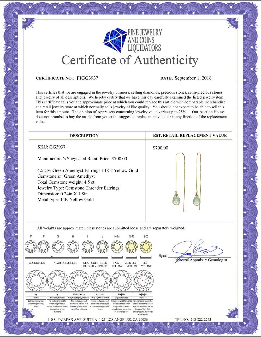 REF-20Y4F - SKU: GG3937 ---- Genuine 4.5 ctw Green Amethyst Earrings 14KT Yellow Gold