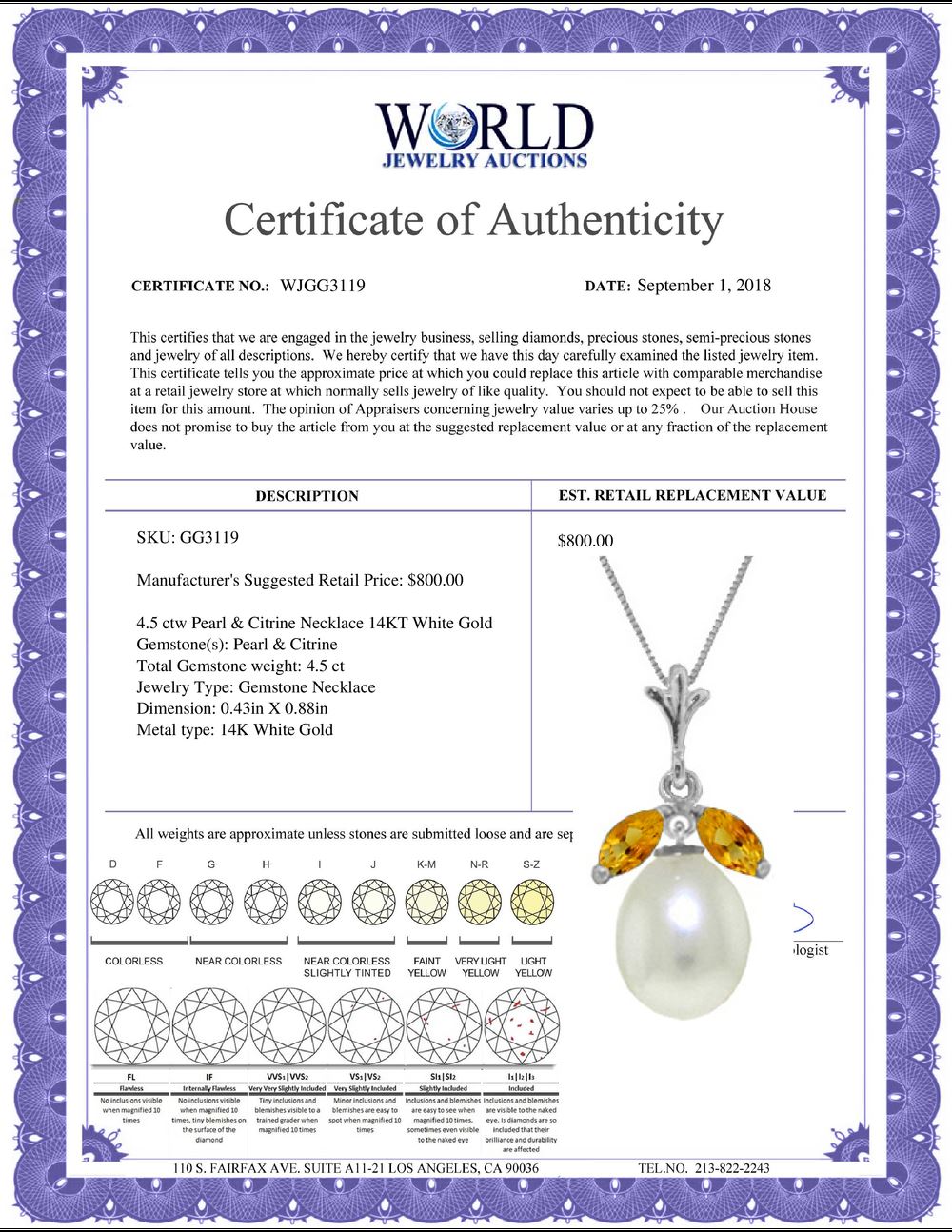 REF-24K3V - SKU: GG3119 ---- Genuine 4.5 ctw Pearl & Citrine Necklace 14KT White Gold