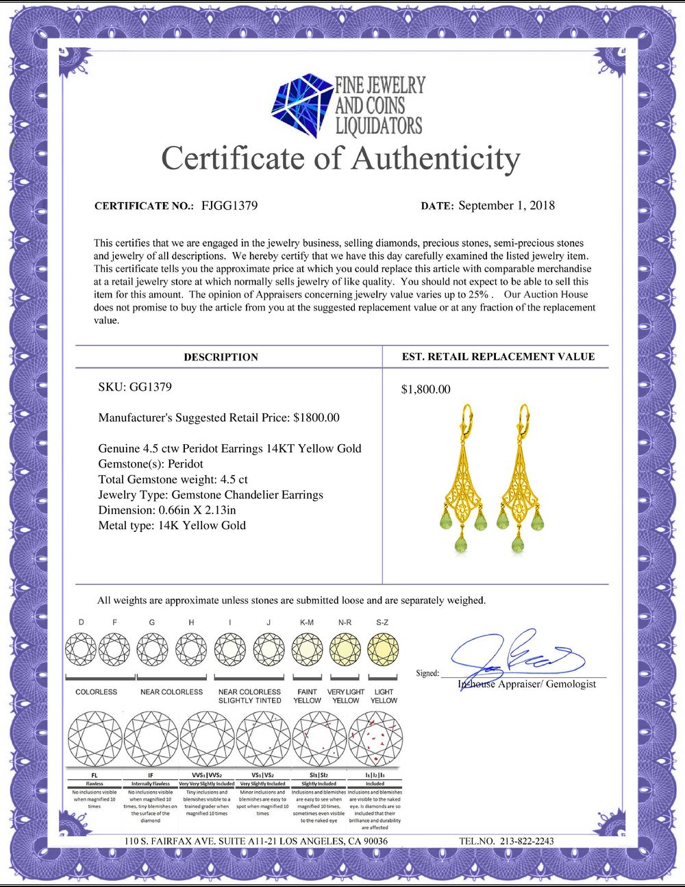 REF-56W7Y ---- SKU:GG-1379 ---- Manufacturer's Suggested Retail Price: $1800.00 ---- Genuine 14K Yellow Gold 4.5 ctw Peridot Earrings