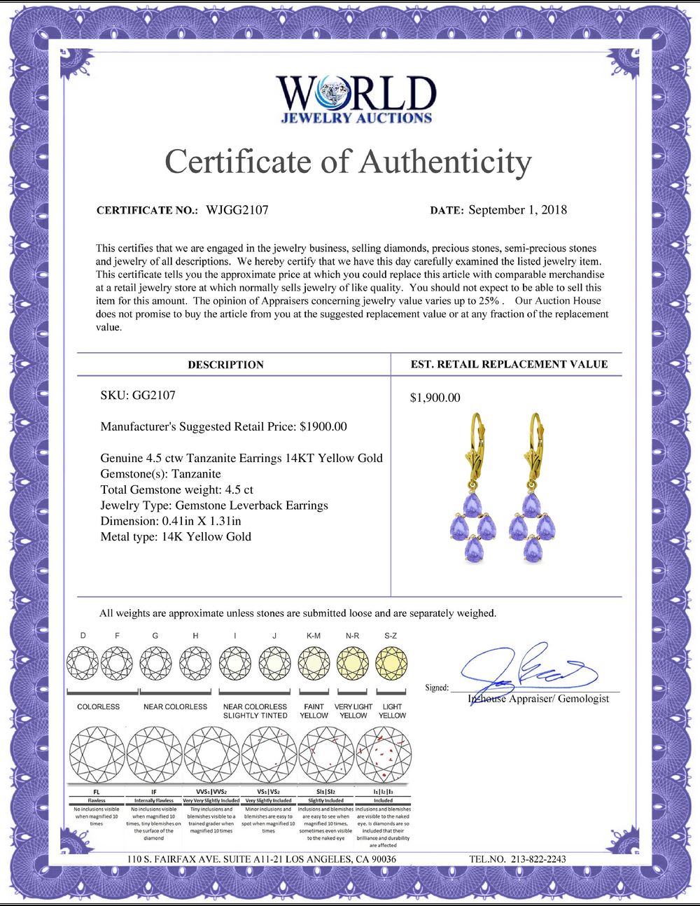 REF-63V2W - SKU: GG2107 ---- Genuine 4.5 ctw Tanzanite Earrings 14KT Yellow Gold