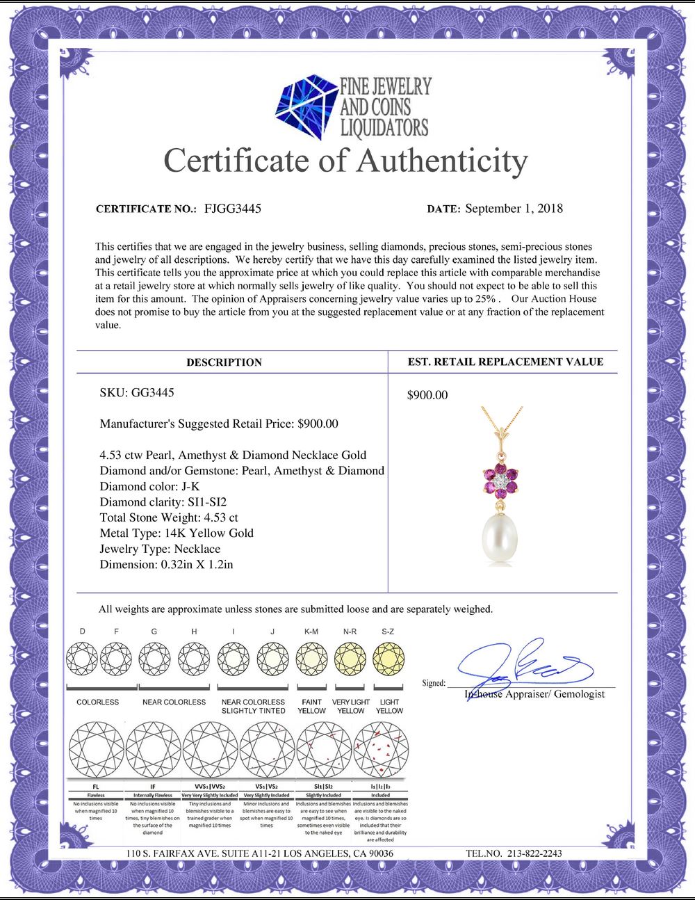 REF-29Y7F - SKU: GG3445 ---- Genuine 4.53 ctw Pearl, Amethyst & Diamond Necklace 14KT Yellow Gold