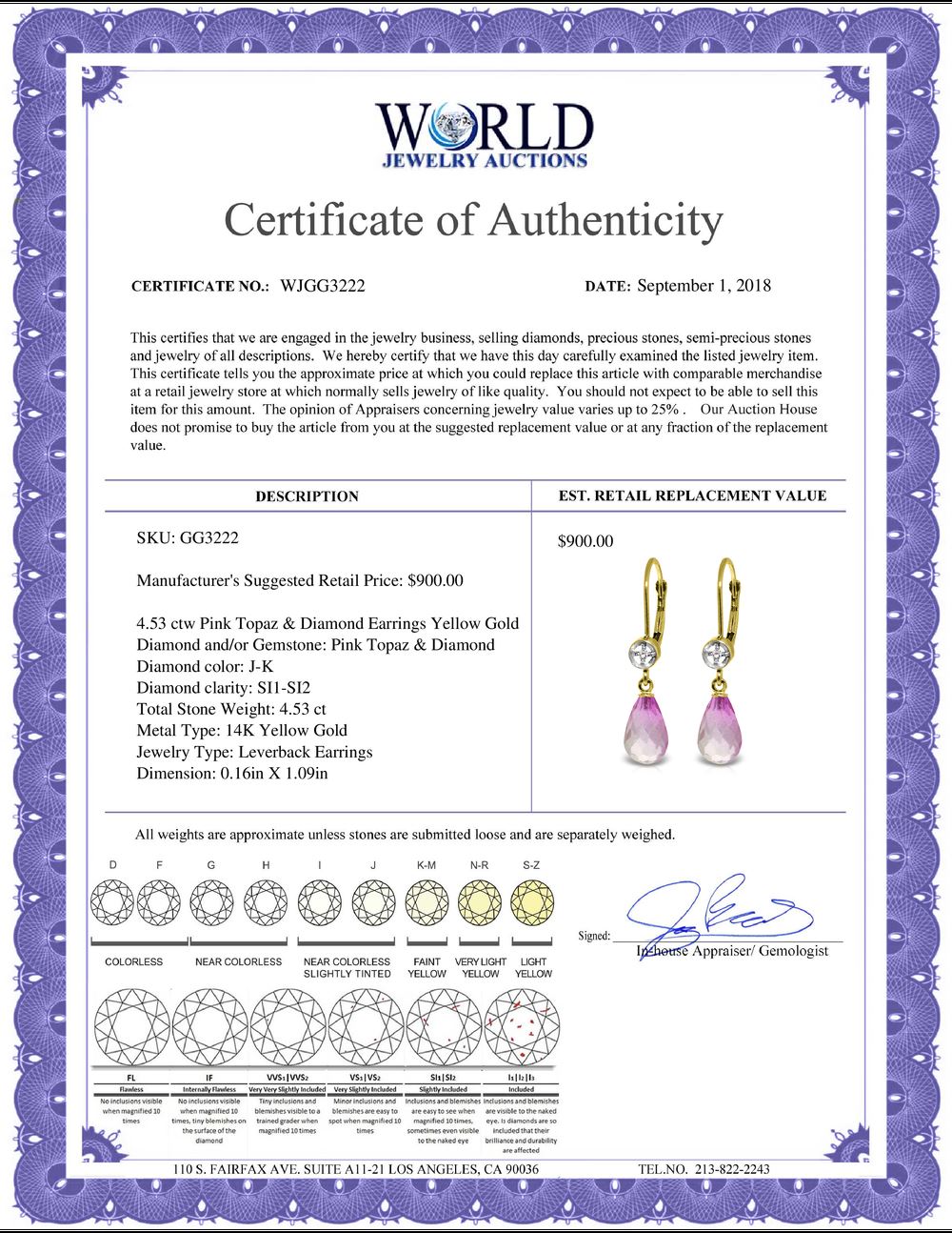 REF-29Z3N - SKU: GG3222 ---- Genuine 4.53 ctw Pink Topaz & Diamond Earrings 14KT Yellow Gold