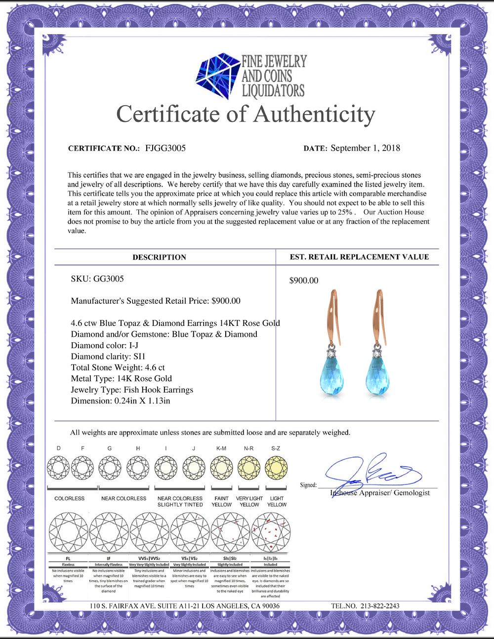 REF-28H8X - SKU: GG3005 ---- Genuine 4.6 ctw Blue Topaz & Diamond Earrings 14KT Rose Gold