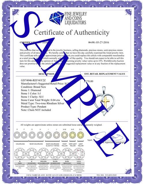 1. All Jewelry items sold are in Brand New Condition. WE AND THE CONSIGNOR DISCLAIM ANY AND ALL WARRANTIES, EXPRESSED OR IMPLIED, INCLUDING BUT NOT LIMITED TO THE IMPLIED WARRANTY OF MERCHANTABILITY OR FITNESS FOR ANY PARTICULAR PURPOSE. NO WARRANTIES ARE MADE THAT ANY OF THE MERCHANDISE COMPLIES WITH ANY APPLICABLE GOVERNMENTAL RULES, REGULATIONS OR ORDINANCES OF ANY KIND OR NATURE WHATSOEVER. All items are available for inquiries prior to bidding. Written and oral descriptions are our opinions and should in no way be construed as a guarantee of any kind as to authenticity, age, condition, materials or any other feature of items being sold. We attempt to catalog every lot correctly and will attempt to point out any defects but will not be responsible or liable for the correctness of the catalog or other descriptions of the lot. We recommend prospective bidders examine all items in which they have an interest. By placing a bid, either in person, by phone, absentee or via the Internet, you signify that you have examined the items as fully as you desire to or that you have chosen not to examine them. If you require absolute certainty in all areas of authenticity, and the results of your evaluation leave uncertainty in your mind, we recommend you have an expert examine the lot for you or do not bid on the item in question.