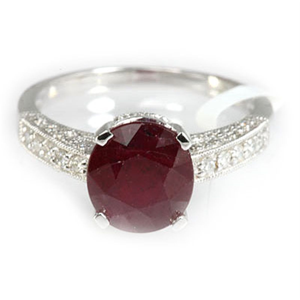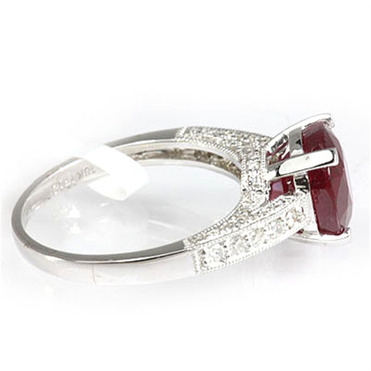 Diamond Clarity: SI1-SI2 ; Diamond Color: G-H ; Metal: 18KT ; Gold: White Gold ; Gold Weight: 4.35 ; Diamond Count: 64RD ; Diamond Weight: 0.31 ; Diamond Count 2: N/A ; Diamond Weight 2: N/A ; Gemstone Count: 1 Ruby ; Ring Size:7 ; Availability: 3-10 Business days, ready to ship, with certification of appraisal will take 2 weeks. ; MSRP: $3812