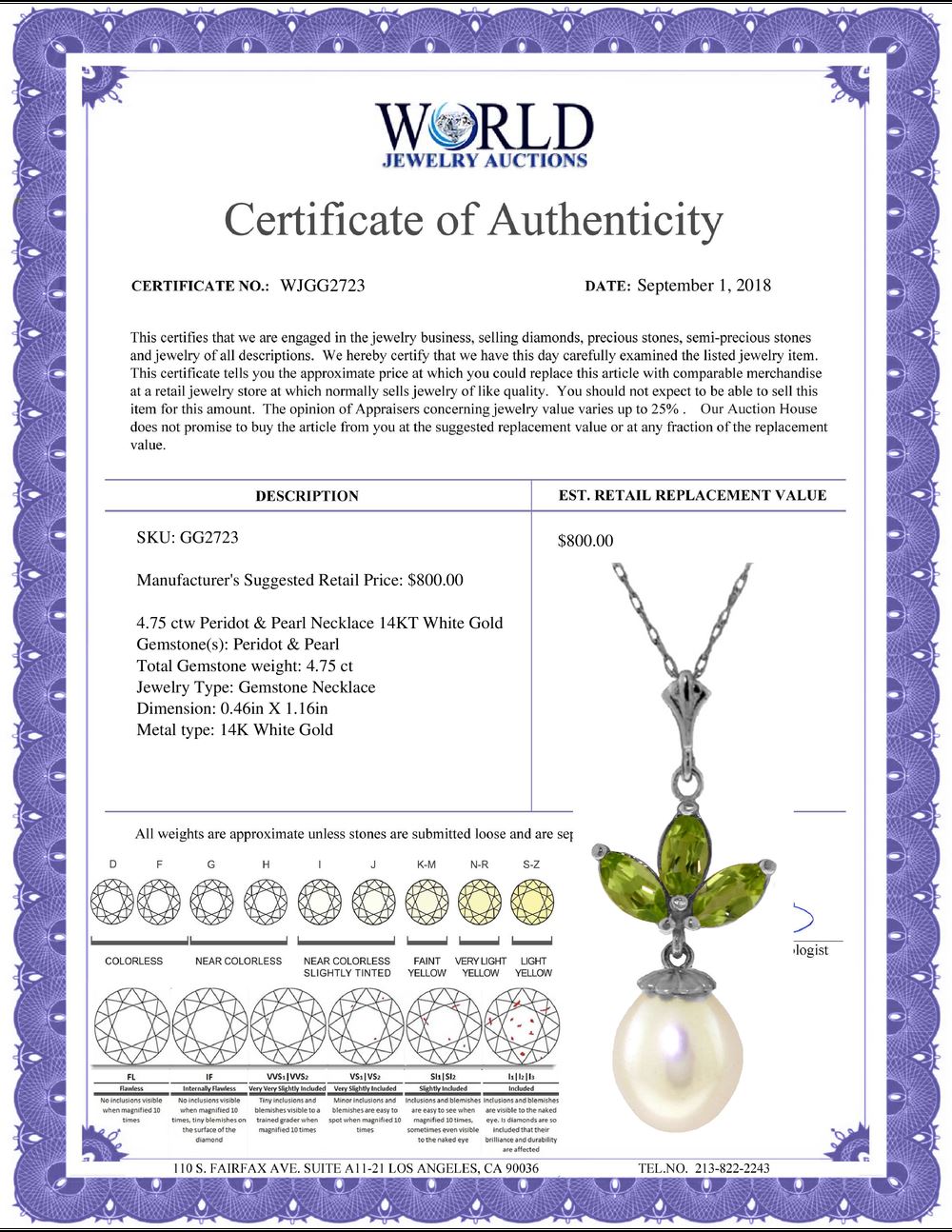 All property is sold “AS IS”, and ALL SALES ARE FINAL. Property is open to thorough public inspection. It is the Bidder’s responsibility to determine condition, age, genuineness, value or any other determinative factor. WJA may attempt to describe the merchandise in advertising and on the Internet but makes no representations. In no event shall WORLD JEWELRY AUCTION be held responsible for having made or implied any warranty of merchantability or fitness for a particular purpose. Bidder shall be the sole judge of value.